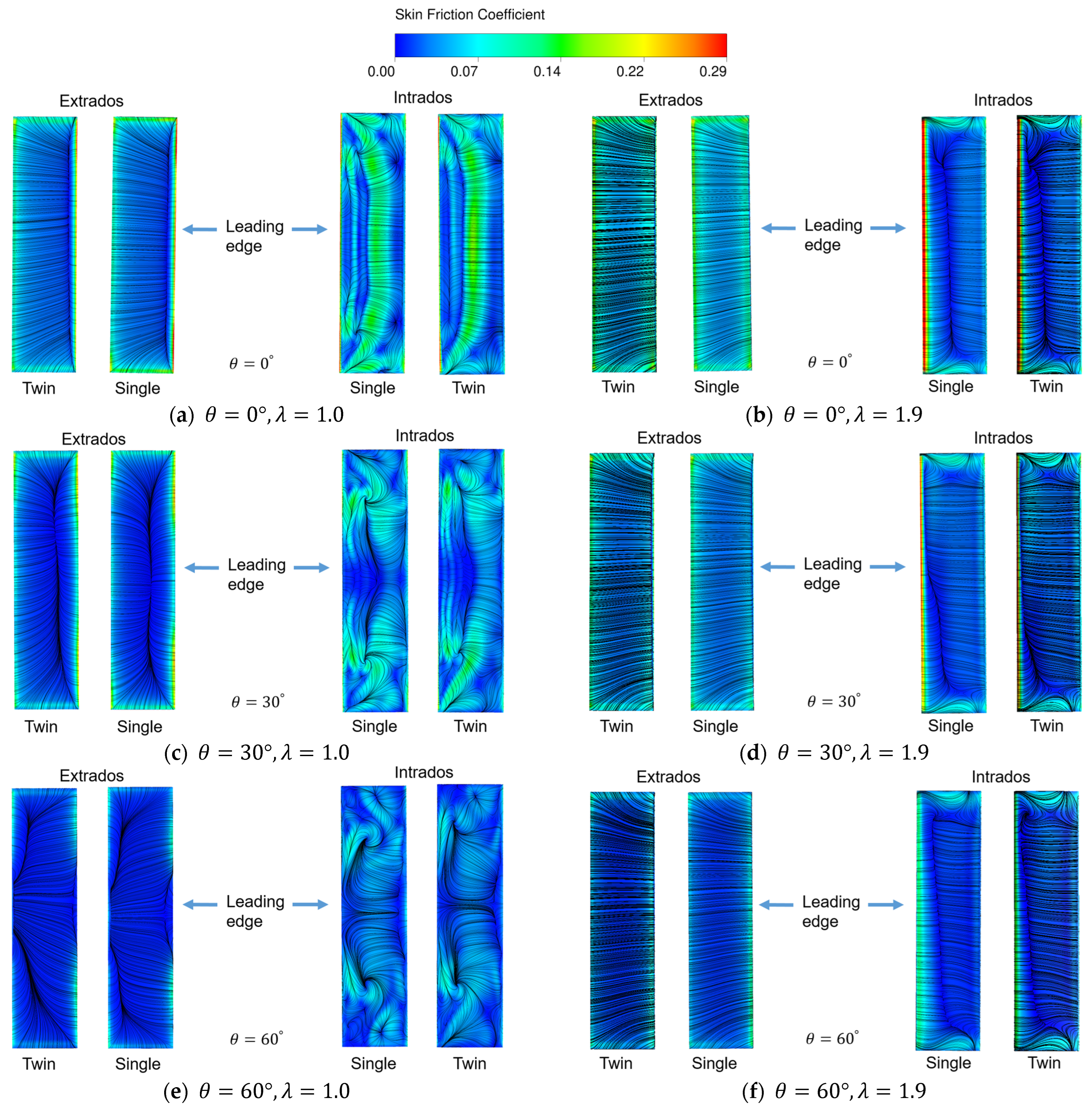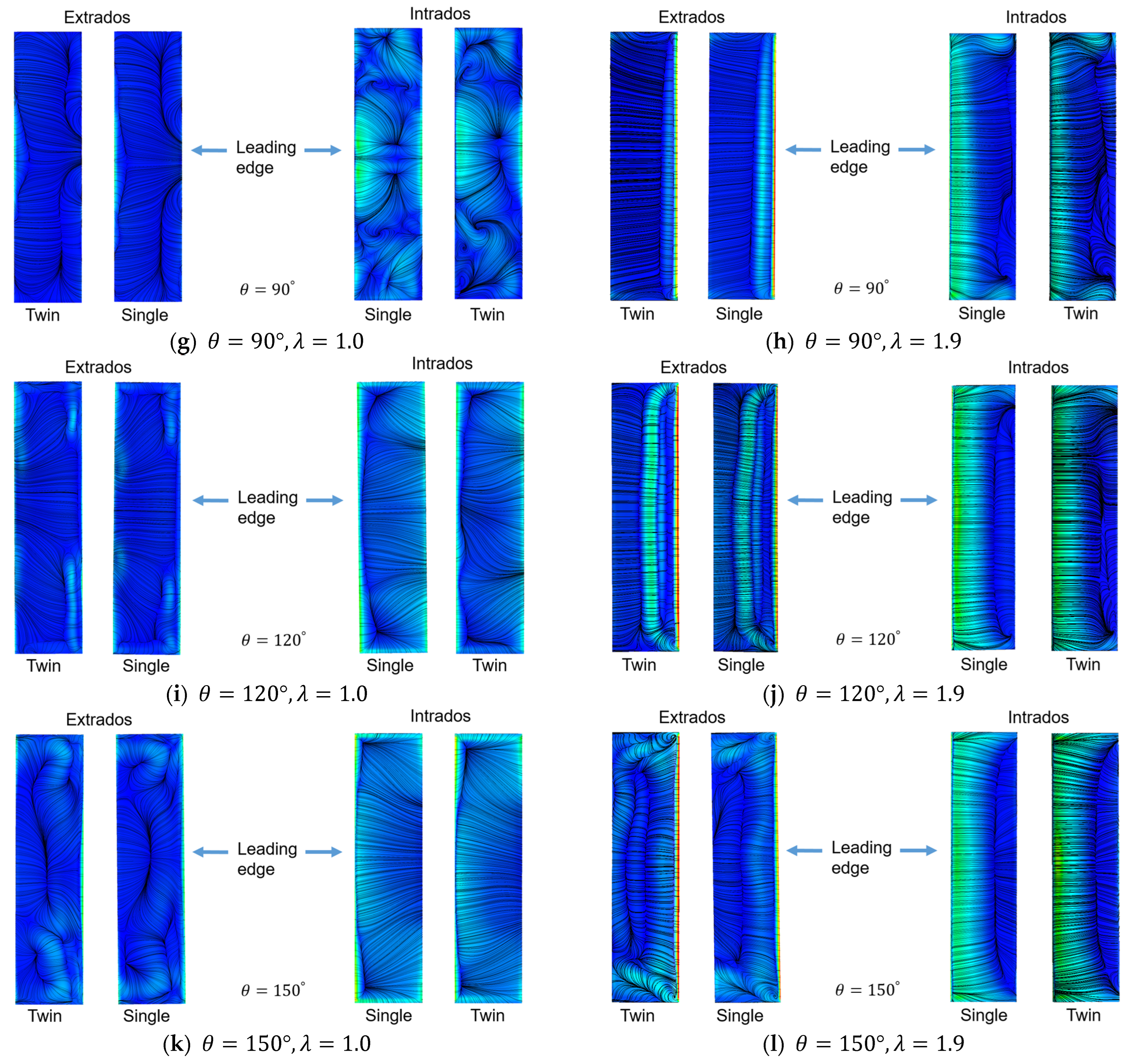 - Visualization of flow structures and analysis of skin friction and pressure coefficient distributions across the blade surfaces quantified the impact of turbine interactions on blade hydrodynamics. Specifically, in the twin-turbine configuration, the bound vortex detachment process is slowed compared to the single-turbine case, altering the distribution of friction lines on the intrados and extrados and thereby modifying the hydrodynamic forces acting on the blades. This delayed vortex shedding, induced by the interaction between the turbine blades at the angular positions where they are closest to each other, produces a temporary increase in lift, which accounts for the torque enhancement observed in the twin-turbine arrangement.