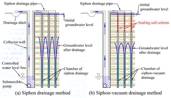- Wang, J.; Shen, Q.; Yuan, S.; Wang, X.; Shu, J.; Zheng, J.; Sun, H. A Siphon Drainage Method for Consolidation of Soft Soil Foundation. Appl. Sci. 2023, 13, 3633. [Google Scholar] [CrossRef]