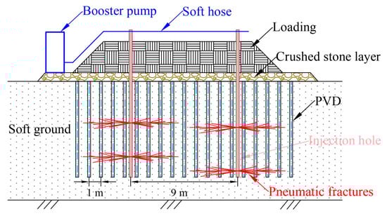 - Wu, H.; Gong, X.; Lin, X.; Song, C.; Ma, Q. In-situ test study on the method of high pressure aerosol injecting structure decomposition drainage consolidation for soft soil ground treatment. Chin. J. Ground Improv. 2020, 2, 98–104. (In Chinese) [Google Scholar]