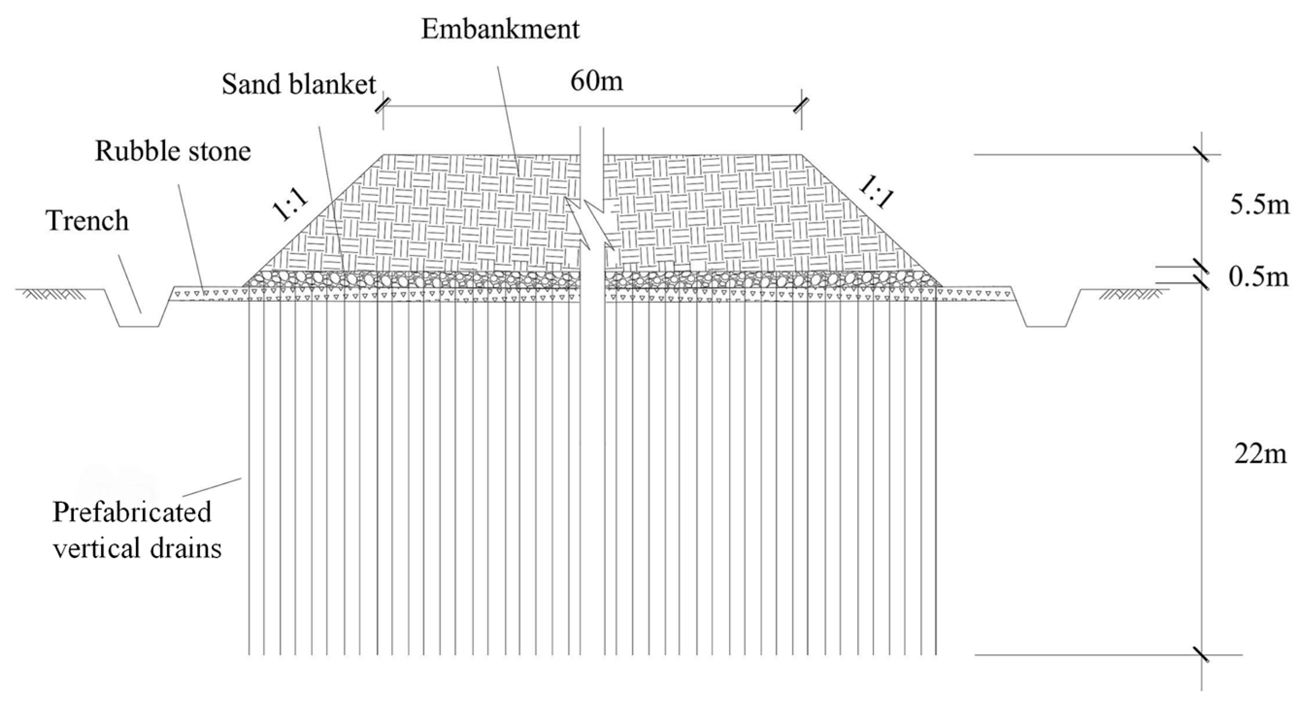 - Wu, J.; Xuan, Y.; Deng, Y.; Li, X.; Zha, F.; Zhou, A. Combined Vacuum and Surcharge Preloading Method to Improve Lianyungang Soft Marine Clay for Embankment Widening Project: A Case. Geotext. Geomembr. 2021, 49, 452–465. [Google Scholar] [CrossRef]