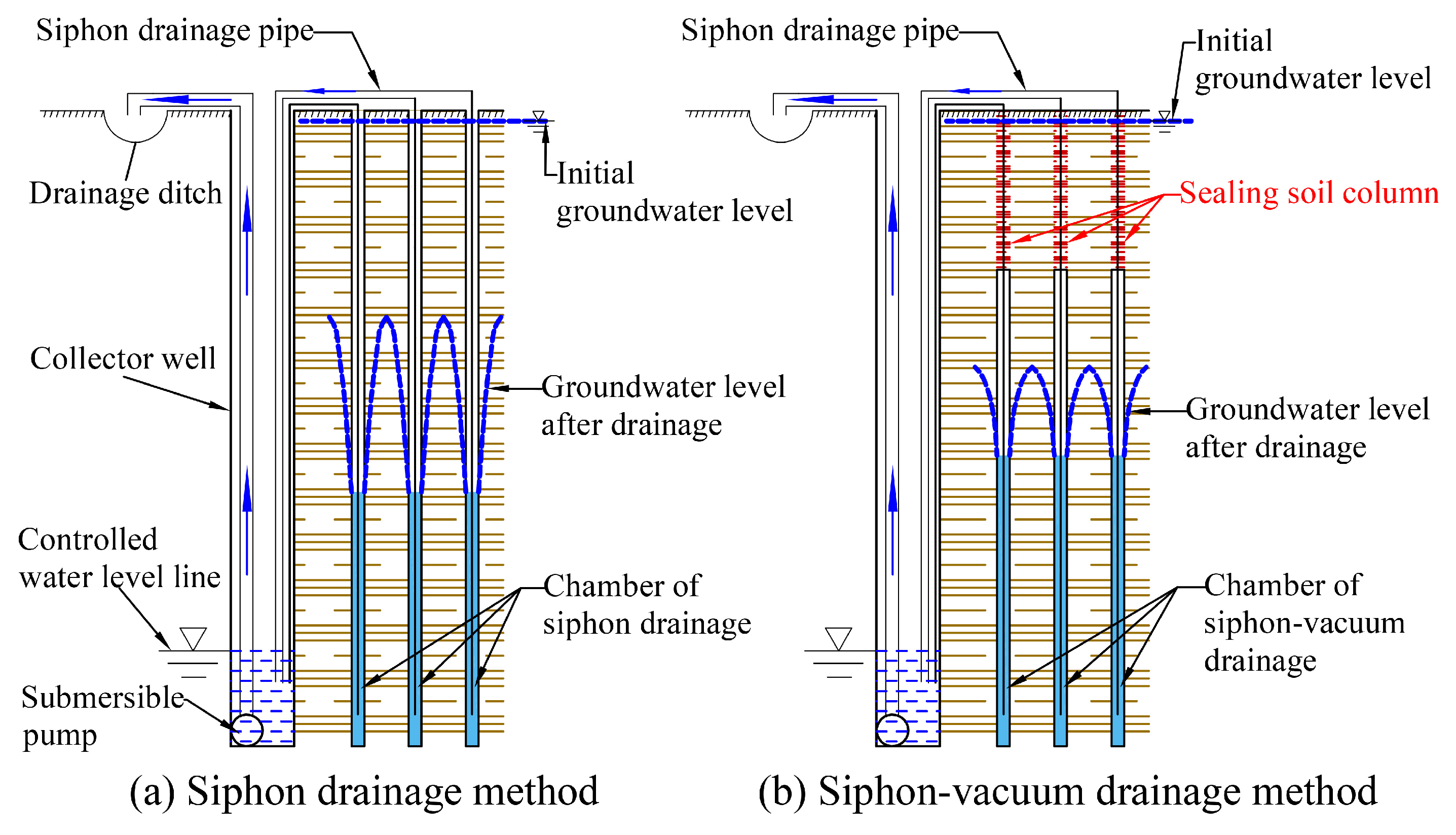 - Wu, G.; Xie, W.; Sun, H.; Yan, X.; Tang, B. Consolidation Behaviour with and without Siphon Drainage. Proc. Inst. Civ. Eng. Geotech. Eng. 2018, 171, 462–470. [Google Scholar] [CrossRef]