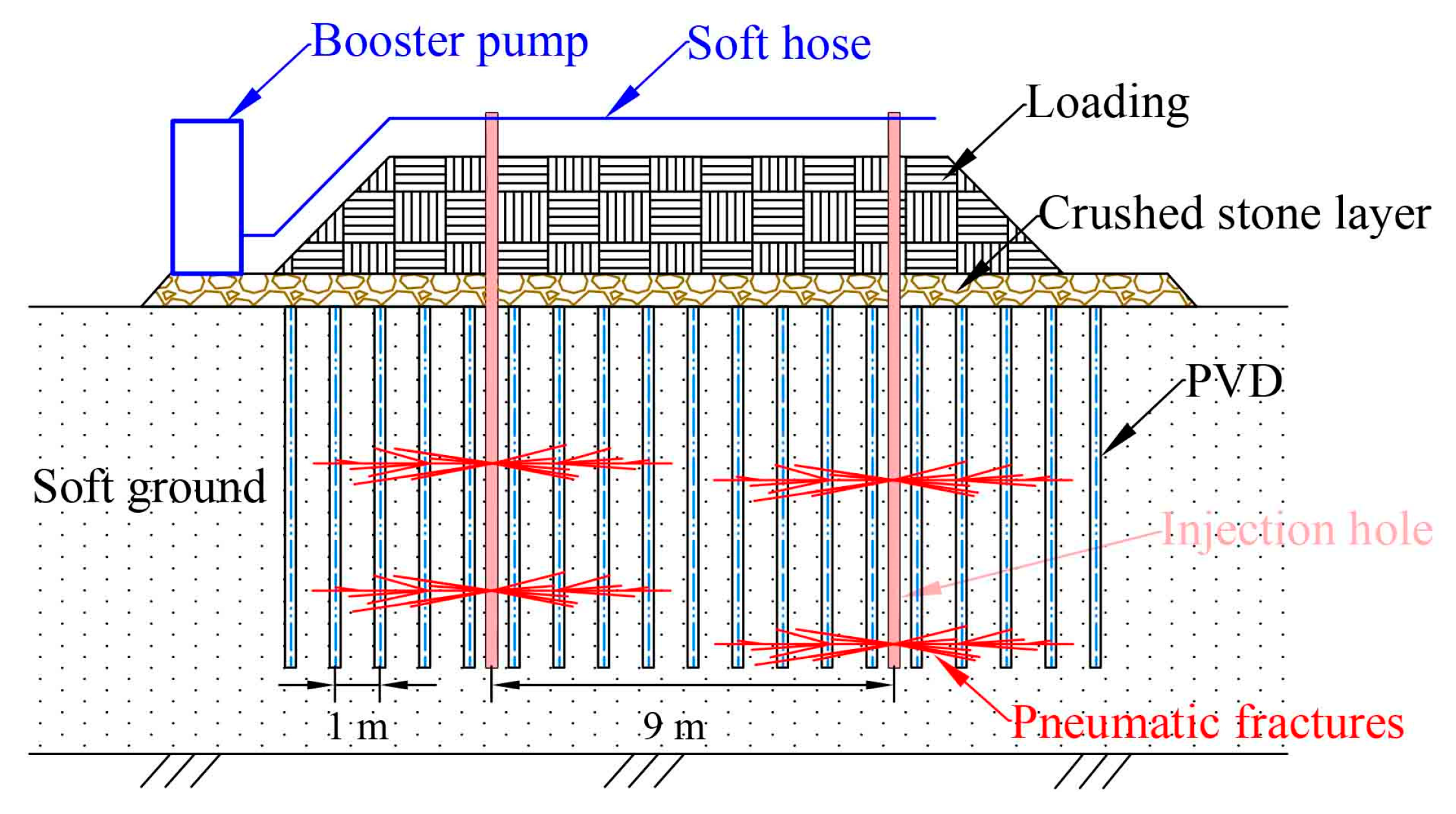 - Wu, H.; Gong, X.; Lin, X.; Song, C.; Ma, Q. In-situ test study on the method of high pressure aerosol injecting structure decomposition drainage consolidation for soft soil ground treatment. Chin. J. Ground Improv. 2020, 2, 98–104. (In Chinese) [Google Scholar]