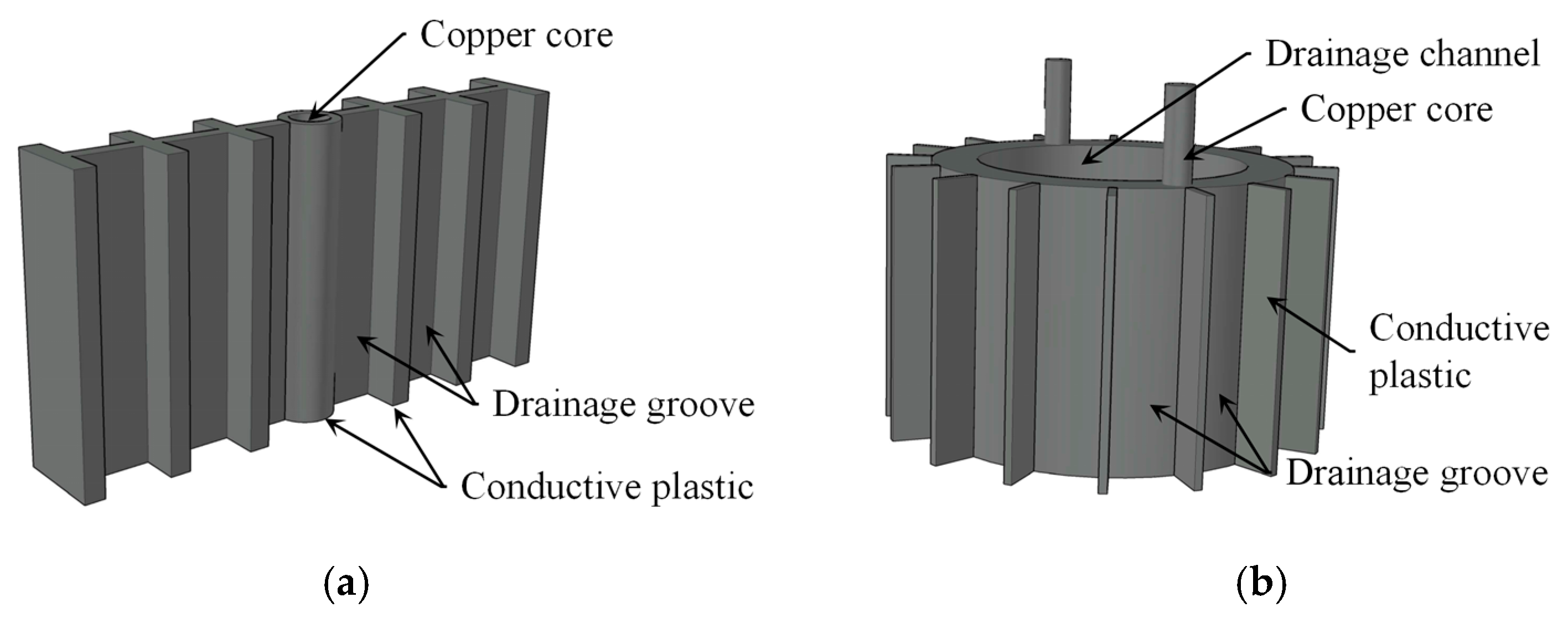 - Gan, Q.; Zhou, J.; Li, C.; Zhuang, Y.; Wang, Y. Vacuum Preloading Combined with Electroosmotic Dewatering of Dredger Fill Using the Vertical-Layered Power Technology of a Novel Tubular Electrokinetic Geosynthetics: Test and Numerical Simulation. Int. J. Geomech. 2022, 22, 5021004. [Google Scholar] [CrossRef]