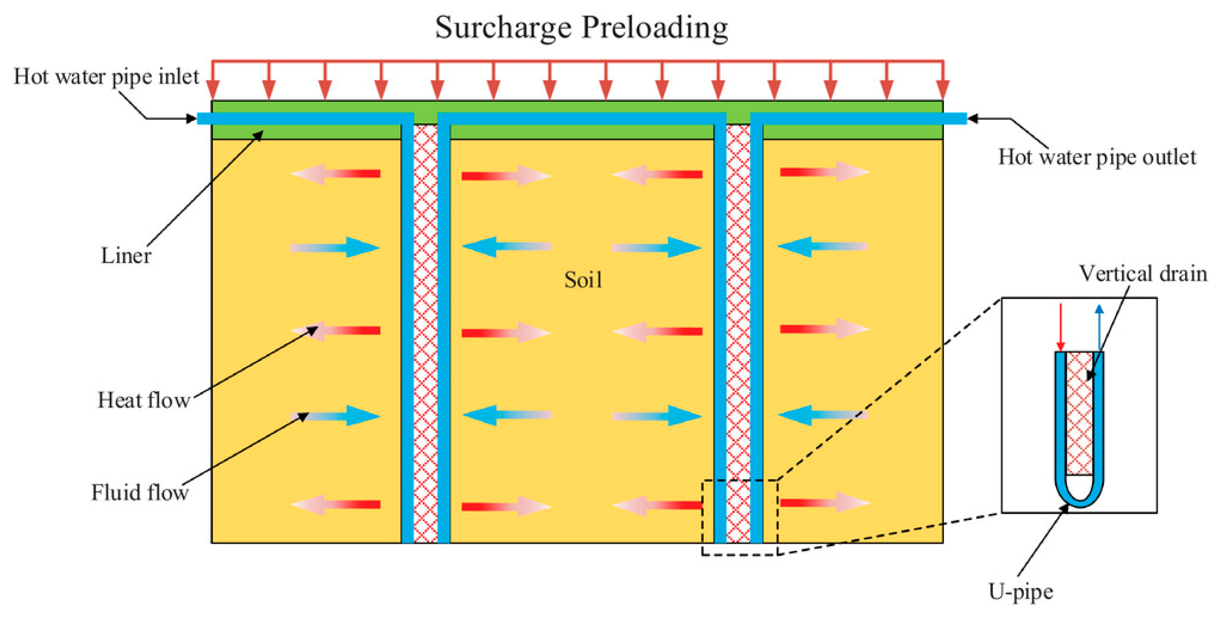 - Xia, C.; Deng, Y.; Zhu, M.; Zheng, L.; Chen, X. Experimental and Computational Analysis of Thermal Consolidation of Prefabricated Vertical Drains Using Solar Energy. J. Clean. Prod. 2023, 387, 135877. [Google Scholar] [CrossRef]