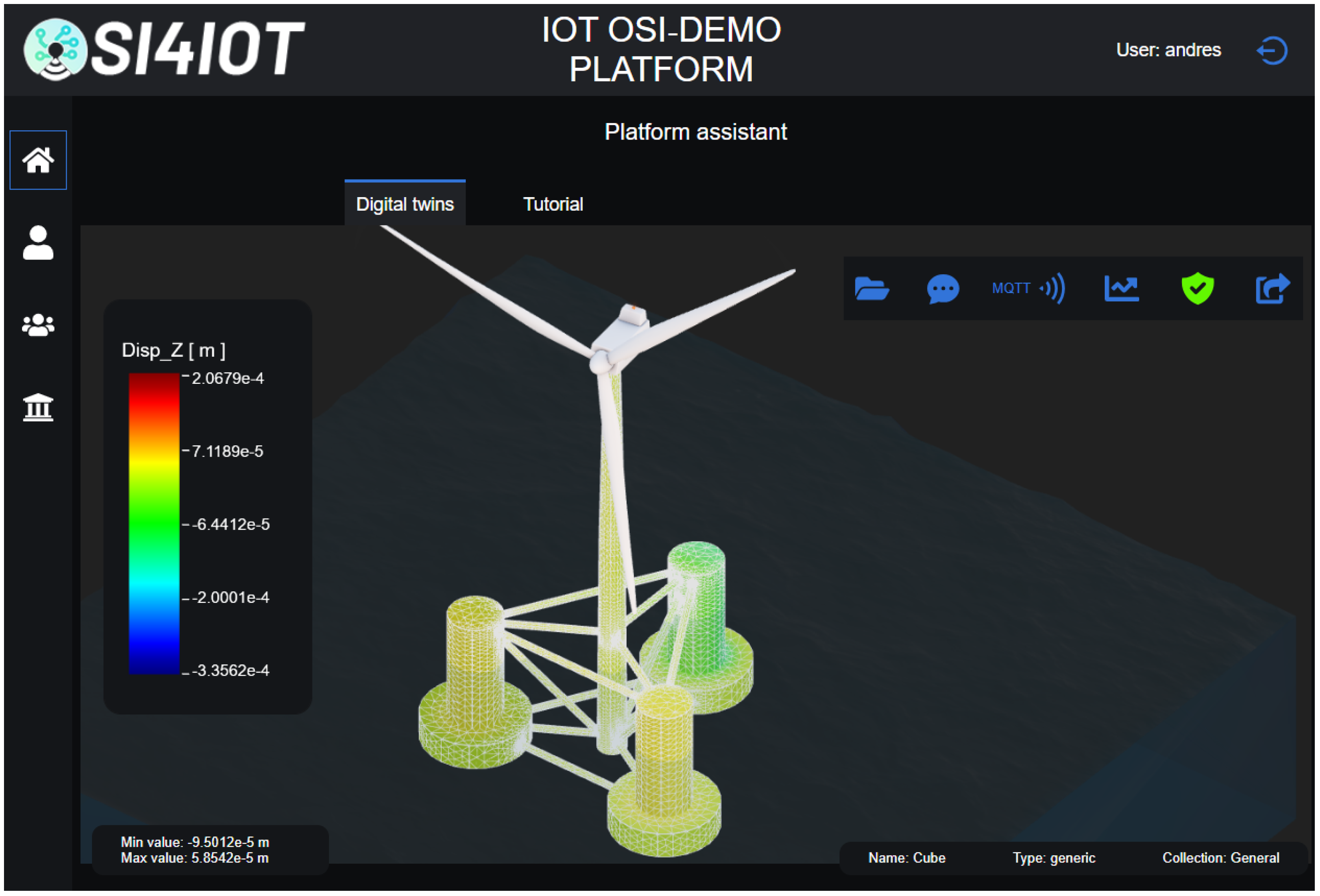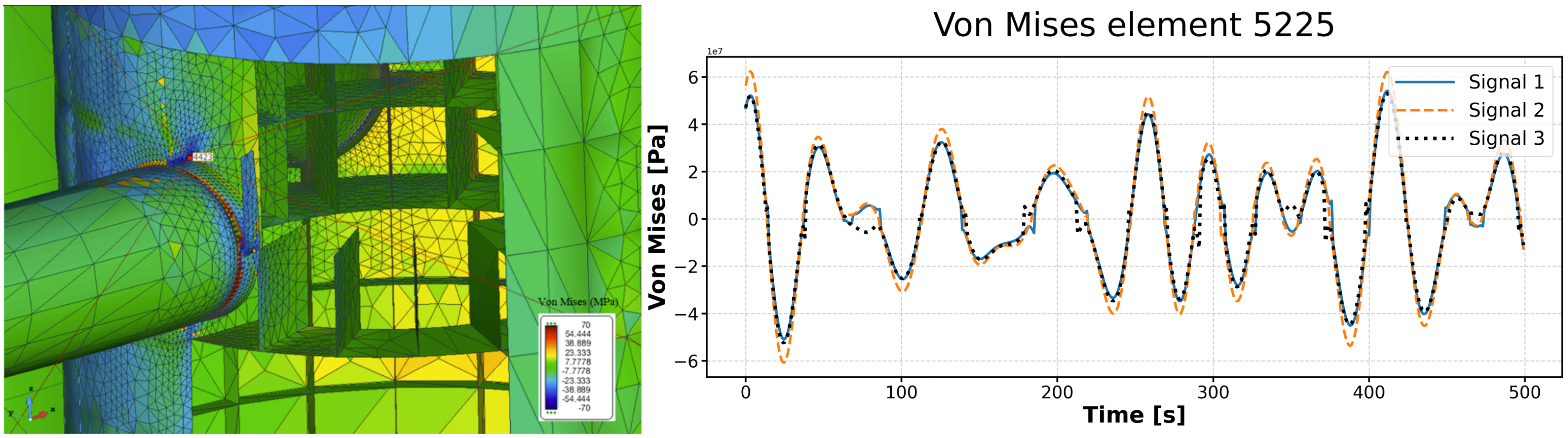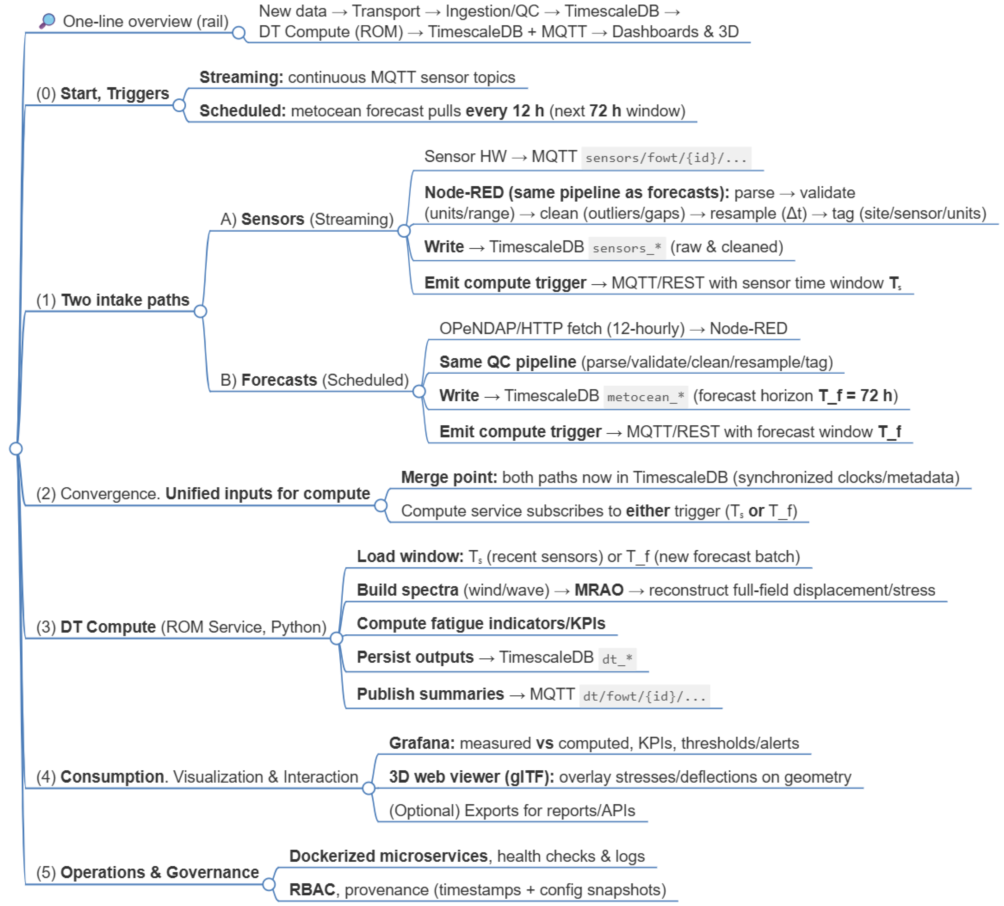 - Compute: The Python (version 3.12) DT service subscribes to metocean/operational topics, generates spectra, runs the MRAO-based ROM, and computes displacements, stresses, and fatigue.