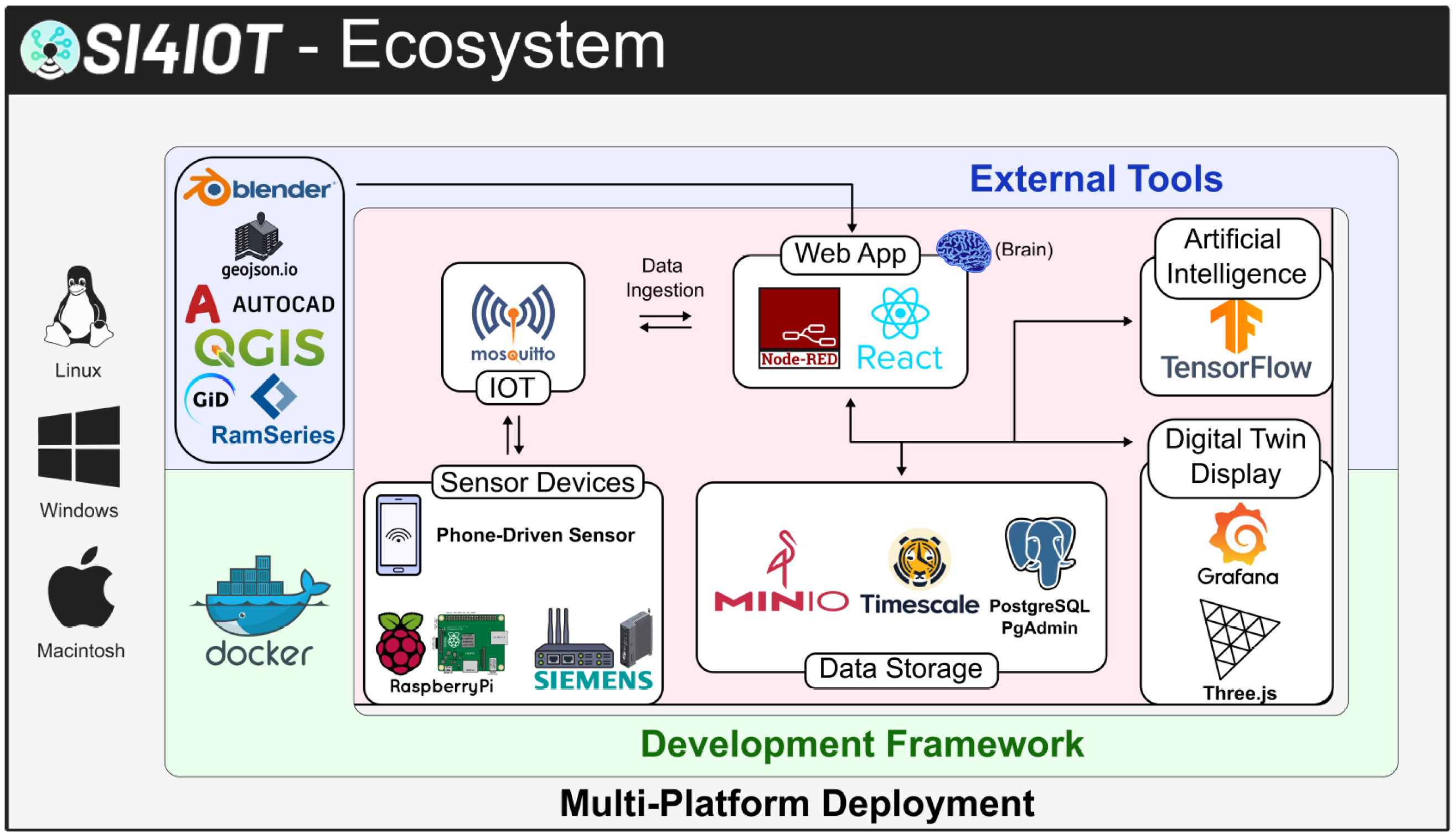- Data ingestion: Sensors publish via MQTT (Mosquitto); forecasts fetched via OPeNDAP/HTTP on schedule.