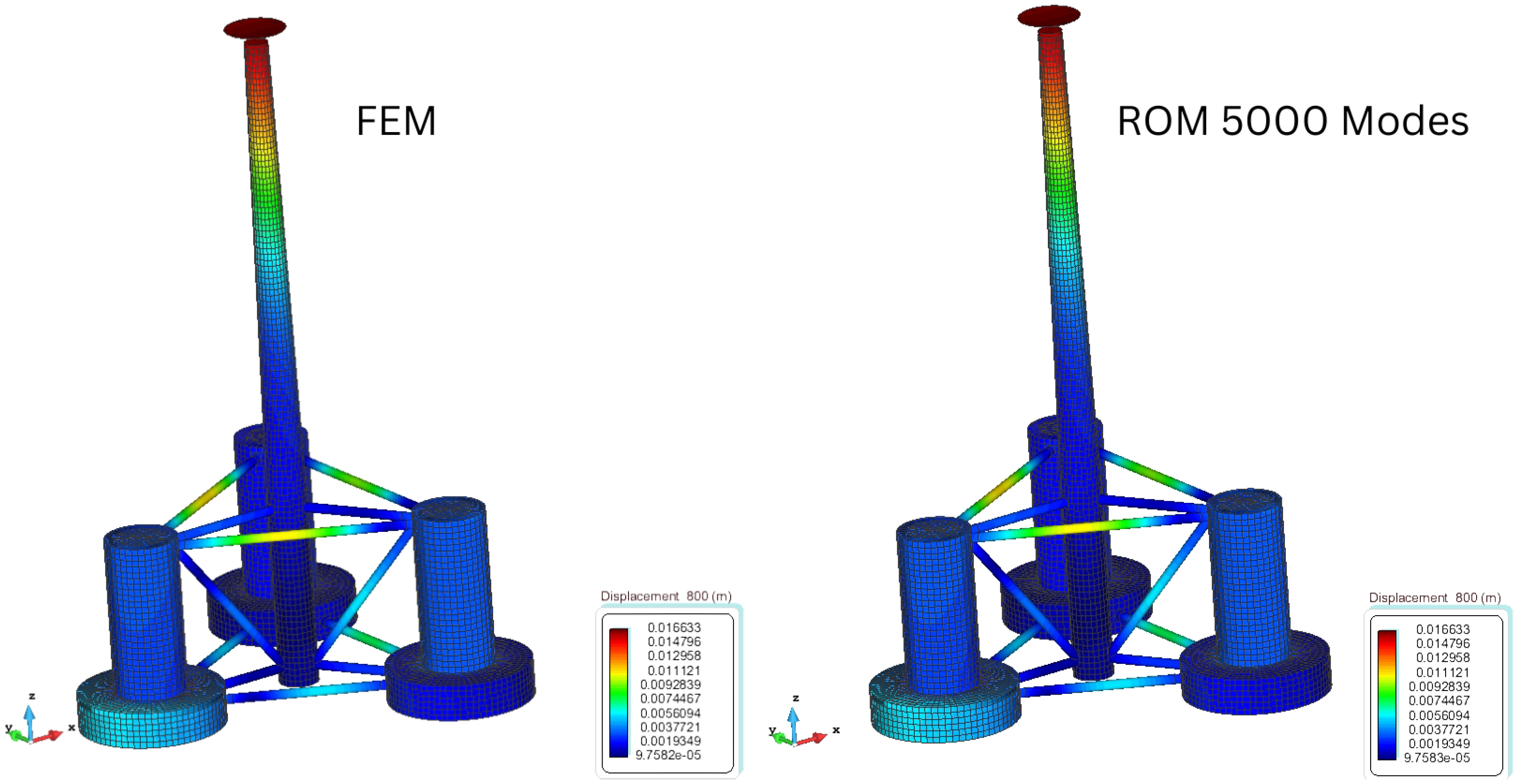- Physics-Based ROM: A reduced-order aero-servo-hydro-elastic model derived from a tightly coupled, time-domain finite-element solver, retaining primary structural modes while providing modal response-amplitude operators (MRAOs). These transfer functions, based on the methodology of Servan-Camas & García-Espinosa (2023, 2025), efficiently map hydrodynamic, aerodynamic, control, and mooring loads to generalized modal coordinates [18,19].
