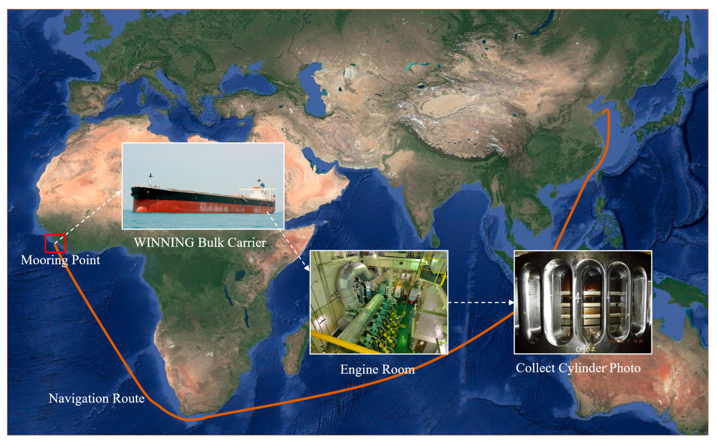This study focuses on the cylinder systems of marine main engines. The data were collected from two large bulk carriers operated by WINNING (Singapore)—WINNING UNIVERSE and SUNNY KANKAN. Each vessel has a deadweight of approximately 200,000 tons and operates on a fixed route between Yantai Port, China, and Boké Port, Guinea, characterized by complex and variable sea conditions, making them highly representative. Both vessels are equipped with MAN B&W 6S60MC low-speed, two-stroke diesel engines featuring six-cylinder configurations, which are widely used in large bulk carriers and are thus considered representative models for this study.