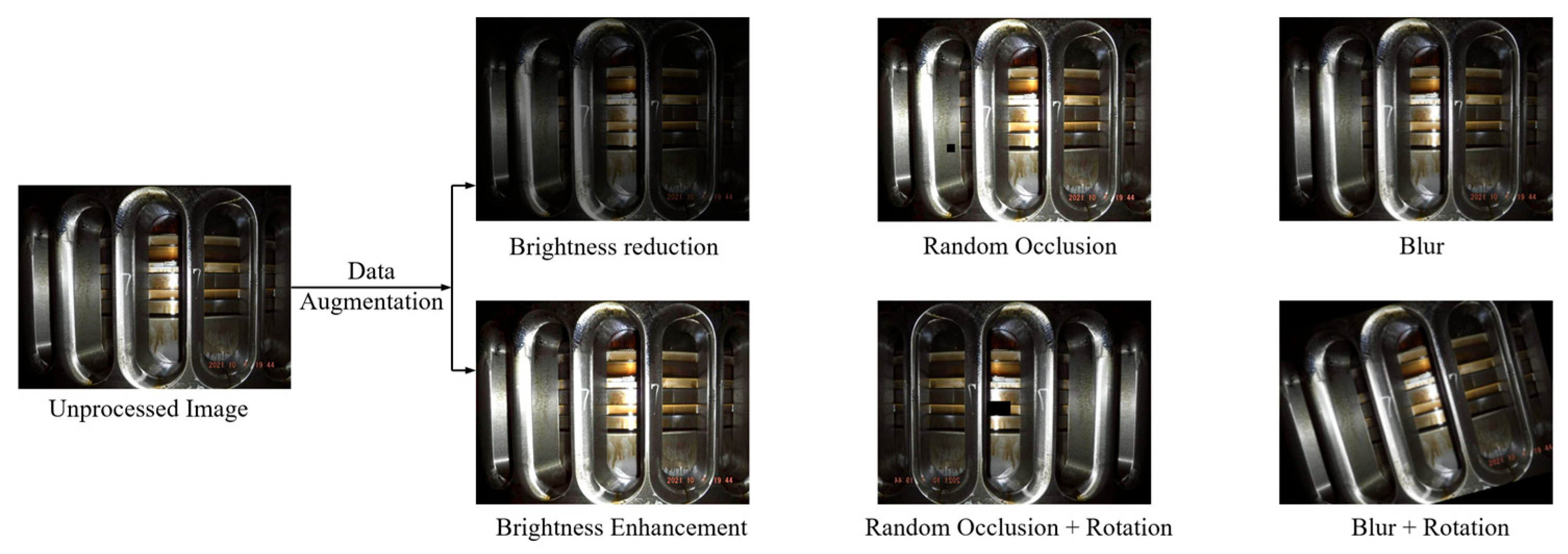 Given the absence of publicly available datasets specifically for marine engine cylinder image retrieval, and the impracticality of capturing scavenging port images during normal ship operation, the image samples in this study are primarily sourced from the bulk carriers WINNING UNIVERSE and SUNNY KANKAN. Due to the limited number of raw images, data augmentation was applied to enhance structural diversity, improve model generalization, and mitigate overfitting. Augmentation techniques included image rotation, random cropping, brightness adjustment, sharpness variation, and random occlusion—simulating variations caused by lighting, equipment, and operator differences. Examples of augmented images are shown in