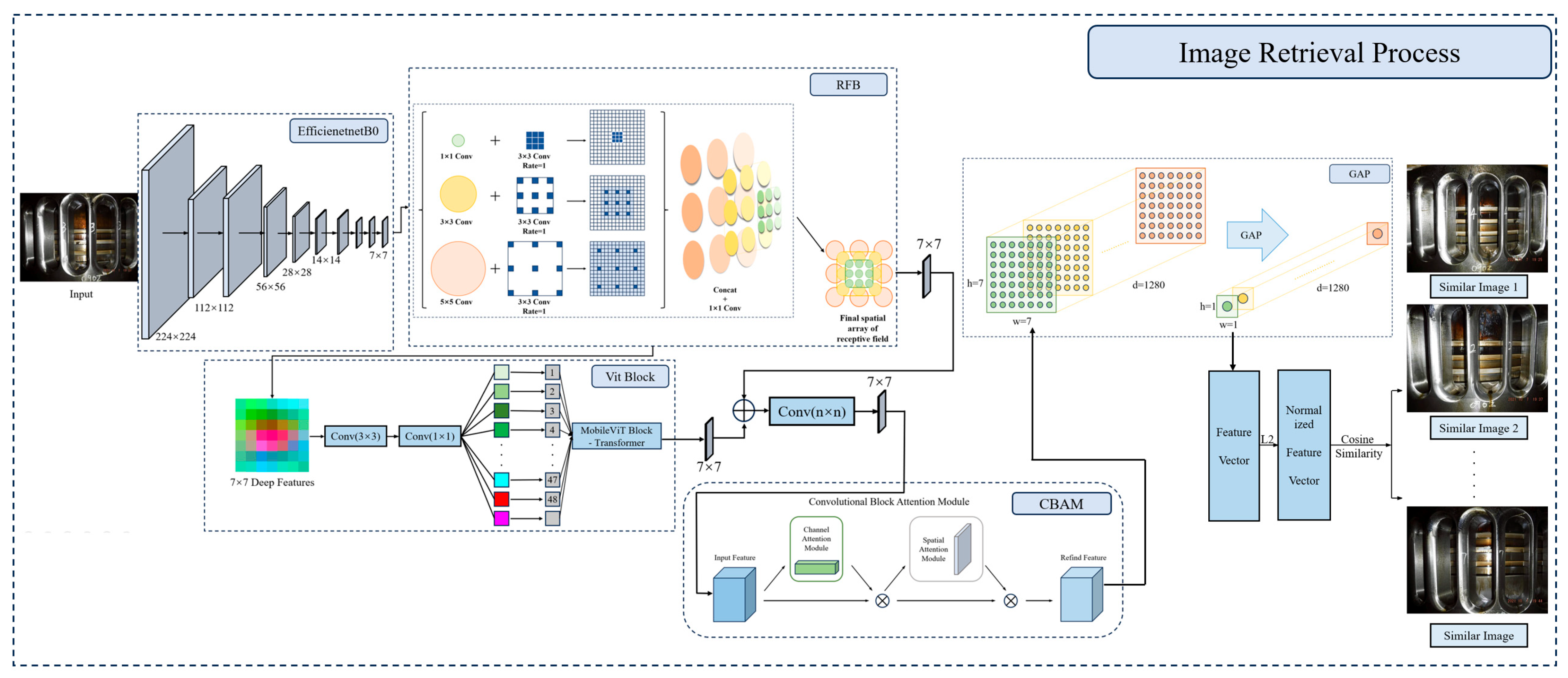 To further enhance the performance of the image retrieval model while meeting lightweight deployment requirements, this study introduces architectural improvements based on EfficientNet-B0. By integrating the RFB, MobileViT Block, and CBAM attention mechanism into the EfficientNet-B0 framework, the model achieves significant gains in feature extraction and representation capability without substantially increasing its size.