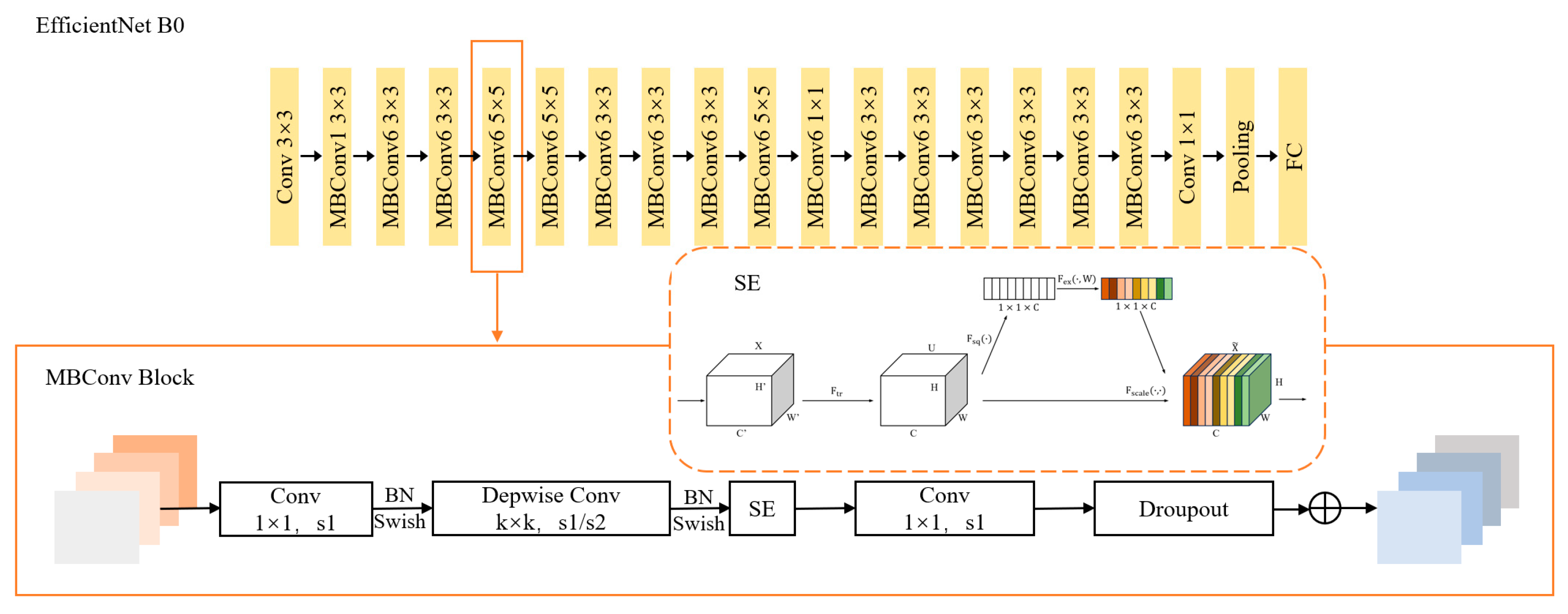 Figure 6. The MBConv module expands channels through a 1 × 1 pointwise convolution, followed by batch normalization (BN) and the Swish activation function, as defined in Equation (1):