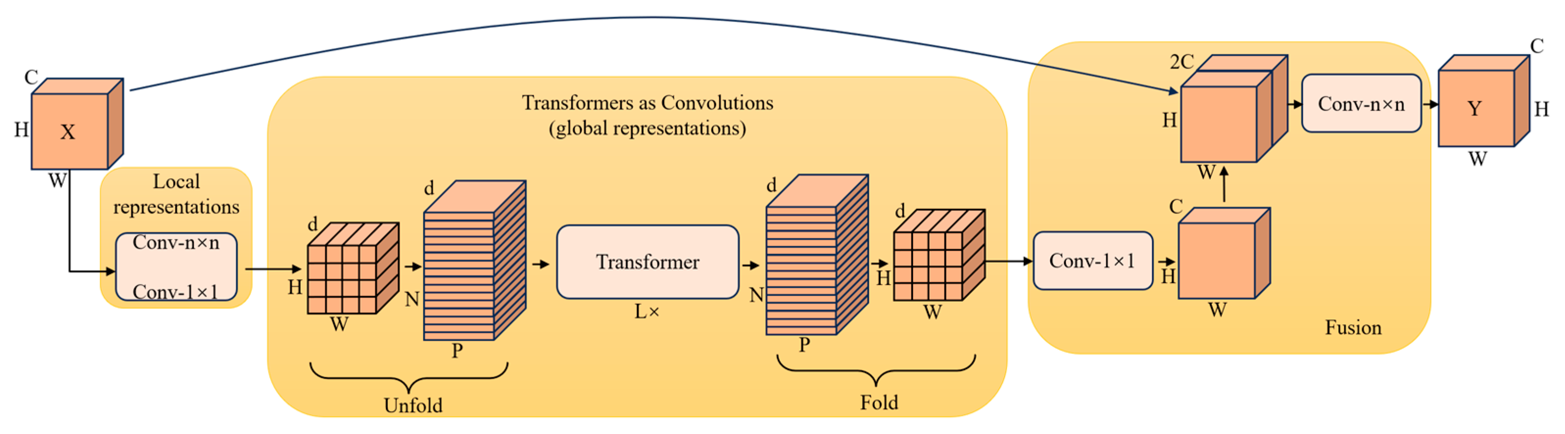 The MobileViT module consists of three components: a local feature encoding module, a global feature encoding module, and a feature fusion module. Its overall architecture is shown in
