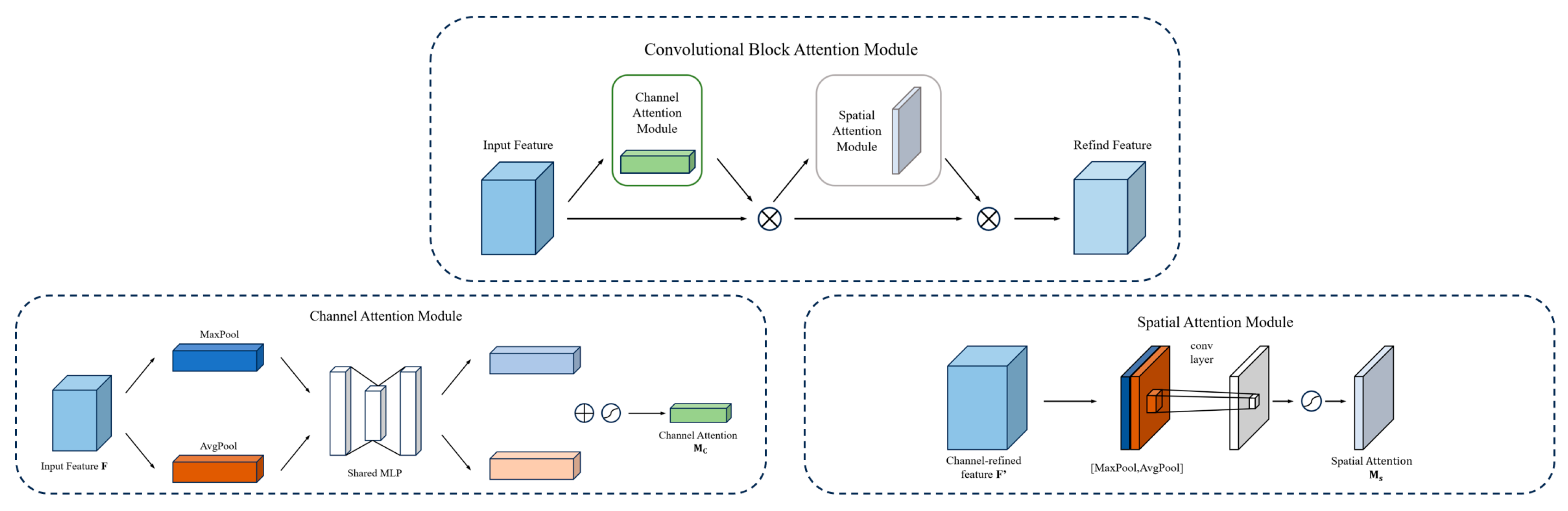 Figure 10, CBAM sequentially applies channel and spatial attention to refine input features. Channel attention generates descriptors via global average and max pooling, which are passed through a shared multilayer perceptron (MLP) to compute channel weights. The reweighted features are then processed by spatial attention, where average and max pooling along the channel dimension produce spatial maps. After concatenation, a 7 × 7 convolution and Sigmoid activation yield the spatial attention map, which is multiplied with the input features to produce the final output. This mechanism adds negligible computational cost while significantly enhancing the model’s focus on informative regions and its feature representation capacity. The attention computation is shown as follows: