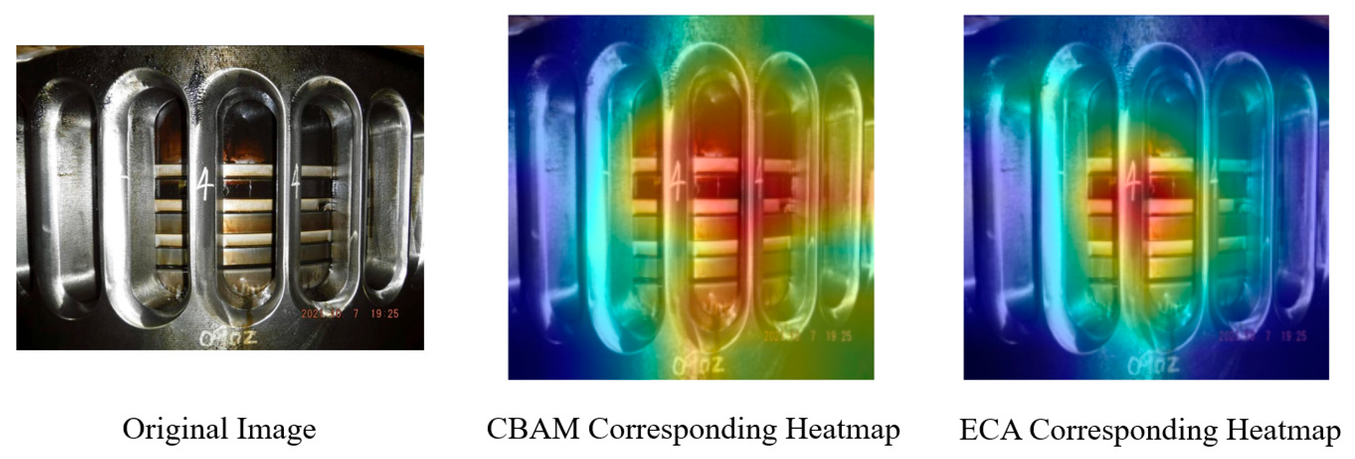 As shown in the heatmap comparison, CBAM (left) yields more comprehensive coverage of the cylinder region, effectively capturing the entire area of interest. In contrast, the ECA heatmap (right) exhibits narrower focus, with a risk of missing critical structures, indicating weaker spatial awareness. The color scale reflects the relative attention intensity, where warmer colors (e.g., red and yellow) indicate regions with higher attention weights, while cooler colors (e.g., blue) represent lower responses. Based on this observation, CBAM was ultimately selected as the preferred attention mechanism for this study.