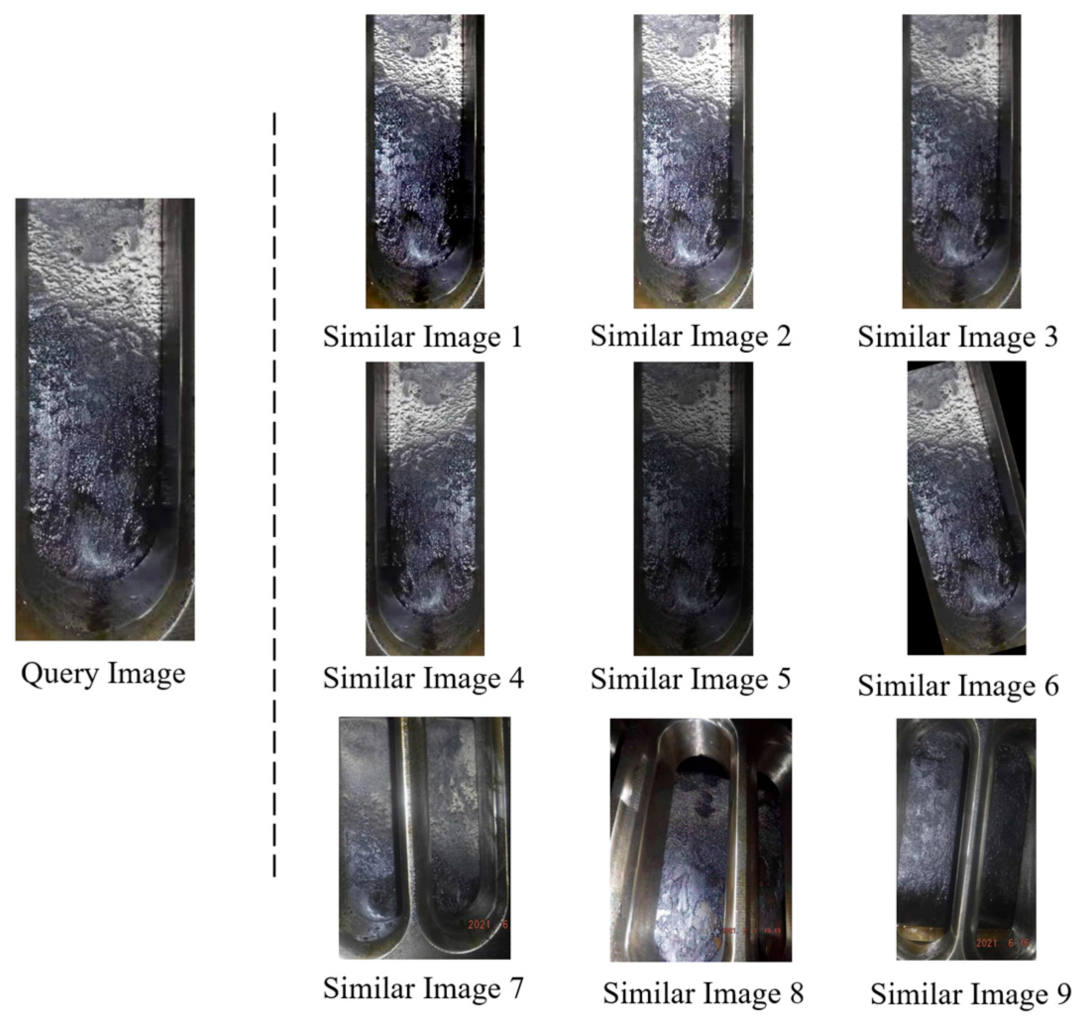 This study aims to develop an image retrieval model for analyzing the lubrication state of marine engine cylinders. To ensure practical applicability and generalization, the collected dataset encompasses typical variations such as carbon buildup and wear under diverse sea conditions. To evaluate the model’s retrieval performance across different operating scenarios, a subset of image samples was randomly selected during the testing phase to conduct real-world retrieval tasks. The objective was to assess matching accuracy and robustness under multi-condition backgrounds. The detailed results are presented in
