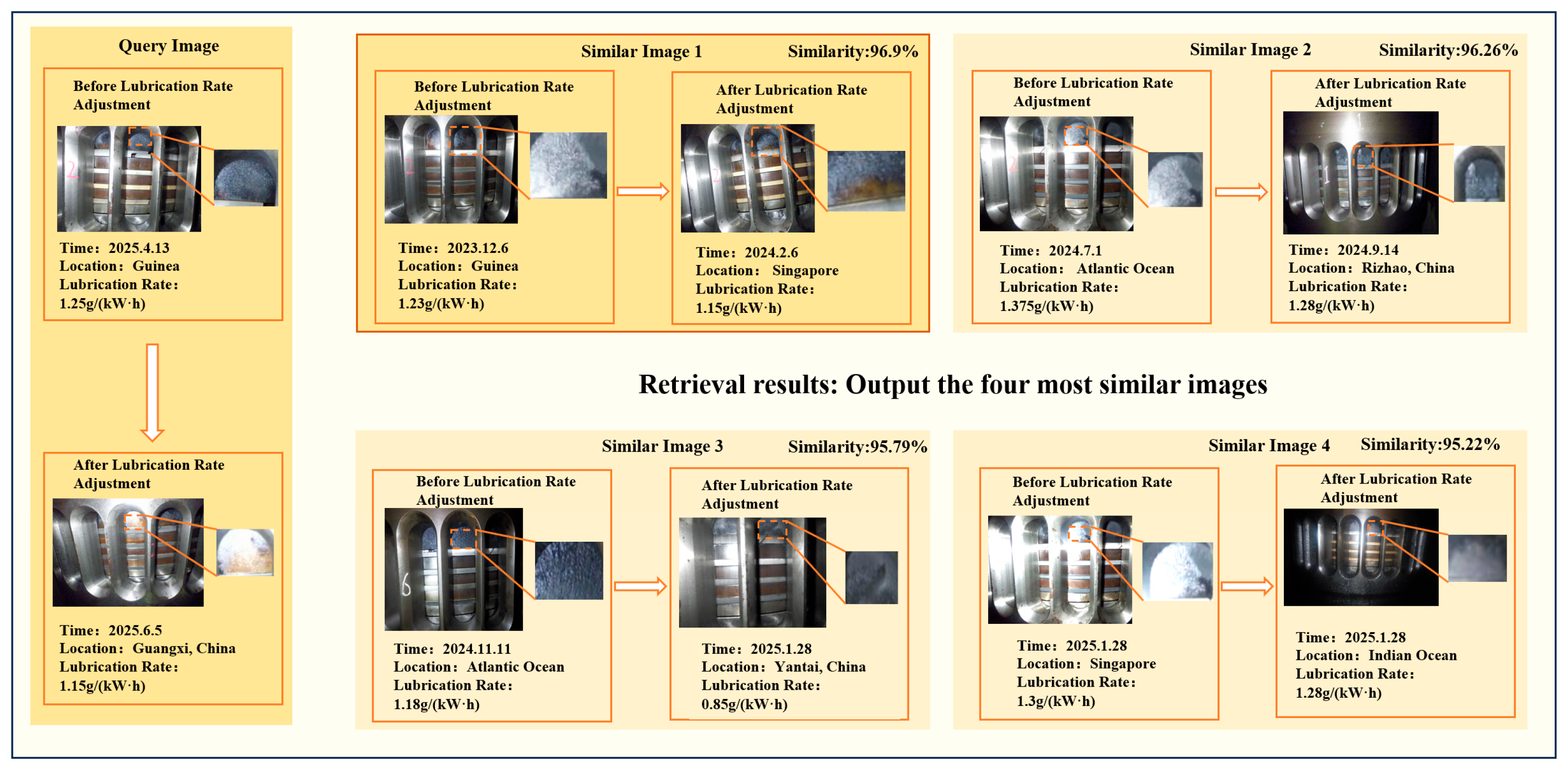 Image Retrieval Results for Lubrication Rate Adjustment: Comparison of Query and Similar Cases.