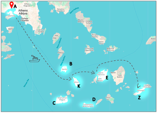 In the realistic case, points A, B, C, …, Z represent actual ports and islands in the Cyclades region, as shown in Table 3 and Figure 2. In Figure 2, the ports and islands of interest are highlighted for emphasis. The distances between ports, for the theoretical and the realistic network, are presented in Table 4, defining the geometry of each network.