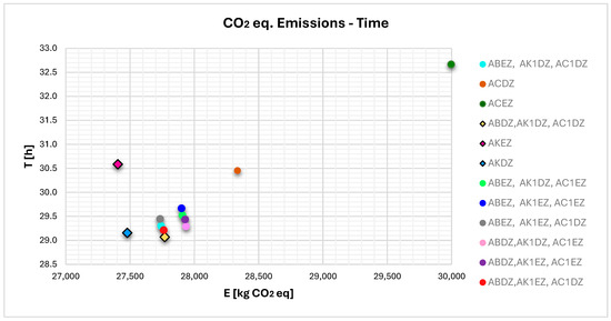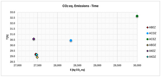 Regarding the realistic network, in the scenario where all ports are assumed to be fully accessible, four routes are identified as Pareto optimal based on dynamic programming. These routes are ABEZ, ABDZ, AKEZ, and AKDZ. This implies that, starting from Elefsis, if the vessel proceeds either towards Serifos or Sifnos and subsequently towards Paros or Folegandros, the resulting route will be considered optimal in terms of the emissions–time trade-off. Consequently, the direction towards Milos is not selected, as it results in higher emissions and longer travel times. This is mainly due to the fact that the four routes, excluding Milos, have relatively small differences in total distance, leading to comparable emissions and travel times. On the other hand, the routes passing through Milos, namely Elefsis–Milos–Folegandros–Amorgos and Elefsis–Milos–Paros–Amorgos, are considerably longer, which results in a notable increase in both time and emissions. The presence of four Pareto optimal routes in this scenario can be attributed to the minimal differences in their total distances. Additionally, since the mean speeds across the individual route segments do not vary significantly, the combination of these input parameters results in non-dominated solutions, as no single route outperforms the others in both objectives simultaneously. The values reported in Table 10 represent the mean values of time and emissions for each route, derived from the fitted probability distributions of speeds. Furthermore, since the trends observed in the CO2 and CO2 equivalent emissions diagrams remain practically identical, given that CH4 and N2O values are significantly lower than those of CO2, only the diagrams based on CO2 equivalent emissions are presented. Figure 5 depicts the CO2 equivalent emissions and the travel time for each route, with the four non-dominated solutions marked by diamonds with a black border.