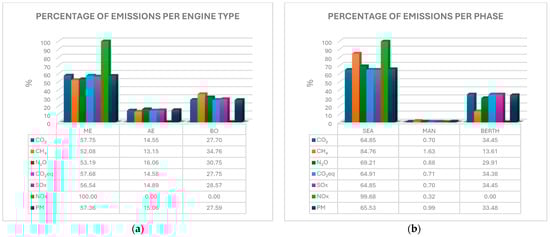 Emissions (%) by (a) engine type and (b) operational phase for AKEZ route.