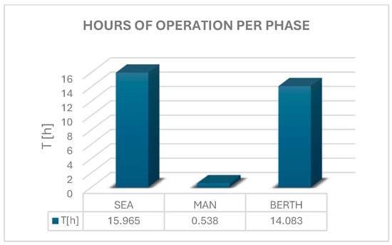 A comparison is made regarding the emissions by engine type and operating phase, where the results are presented as percentages through bar charts. This comparison is conducted for one of the optimal routes, specifically the AKEZ route. As shown in Figure 8, the majority of emissions originate from the main engine. Specifically, depending on the type of emission, the main engine contributes between 52% and 58% of the total emissions, with the exception of NOx emissions, which are exclusively produced by the main engine. Similarly, regarding the comparison between operational phases, as shown in Figure 8, most emissions are produced during navigation. The relatively large difference between at-berth and manoeuvring emissions is due to the fact that ships remain at berth for several hours, whereas manoeuvring lasts only a few minutes, as shown in Figure 9.