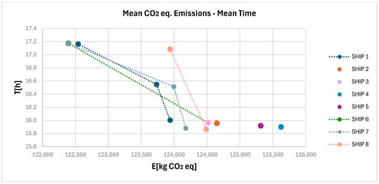 In this scenario, a fleet of eight identical vessels is examined, where certain mean speed values vary between the ships. The aim is to investigate how speed influences emissions and travel time, and consequently, the selection of the optimal route. Ship 1 corresponds to Scenario 4 of the theoretical case and has three non-dominated (Pareto optimal) solutions: ACDZ, AKDZ, and ABEZ, AK1DZ, AC1DZ. By contrast, for Ships 2, 3, 4, and 5, only one optimal solution is observed in each case. For instance, in the case of Ship 2, where there is an increase in the mean navigation speed by 1 kn in segment DZ, it is observed that the CO2 equivalent emissions in AKDZ increased by 2.3% (from 123,733.39 to 126,612.23 kg), while the travel time did not decrease significantly enough for route AKDZ in order to remain non-dominated. A similar outcome is observed for route ACDZ, where, in addition to the 1 kn increase in mean speed in segment DZ, the speed in segment CD was also increased by 0.5 kn. As a result, the route ABEZ, AK1DZ, AC1DZ emerges as the only non-dominated solution, achieving both lower emissions and a shorter travel time. This analysis indicates that different combinations of speeds can affect both emissions and travel time, hence influencing the non-dominated solutions within the trade-off. Figure 10 presents the non-dominated solutions for each case, which are connected by dashed lines when their number exceeds two, thereby highlighting the number of optimal routing options for each vessel. For the given cases, the route ABEZ, AK1DZ, and AC1DZ consistently belongs to the set of optimal solutions, whereas ACDZ is optimal in four cases and AKDZ in only two.