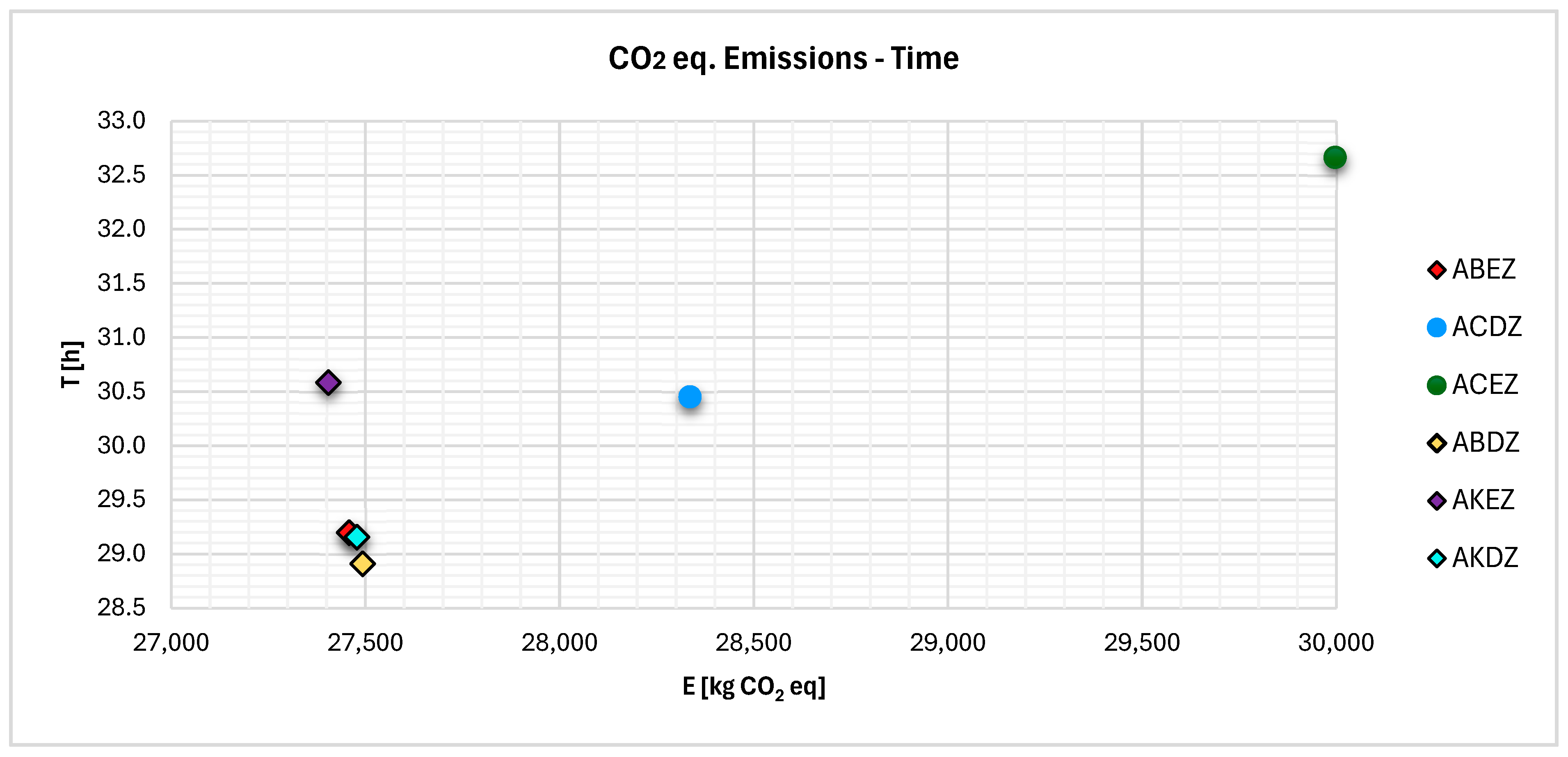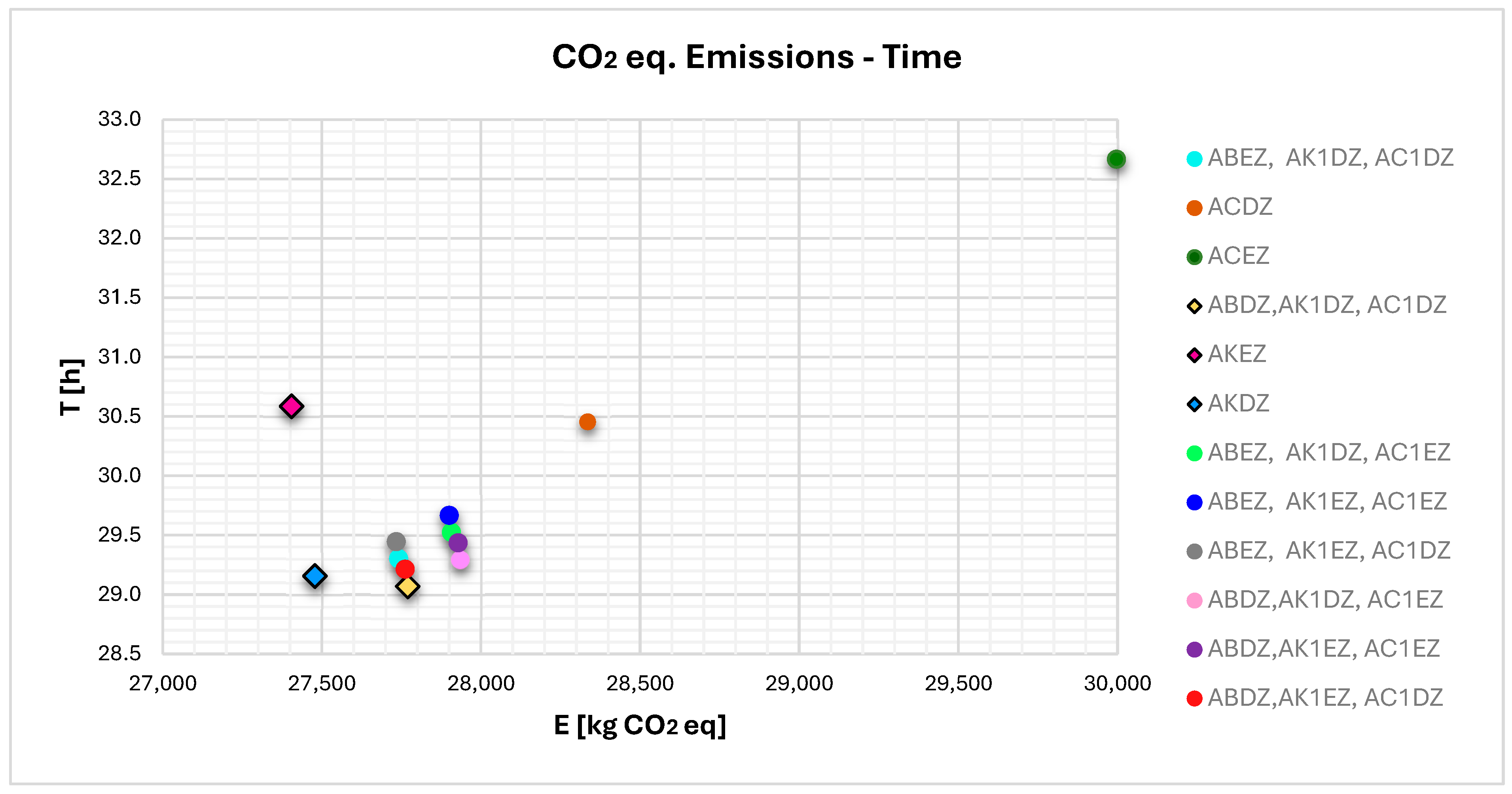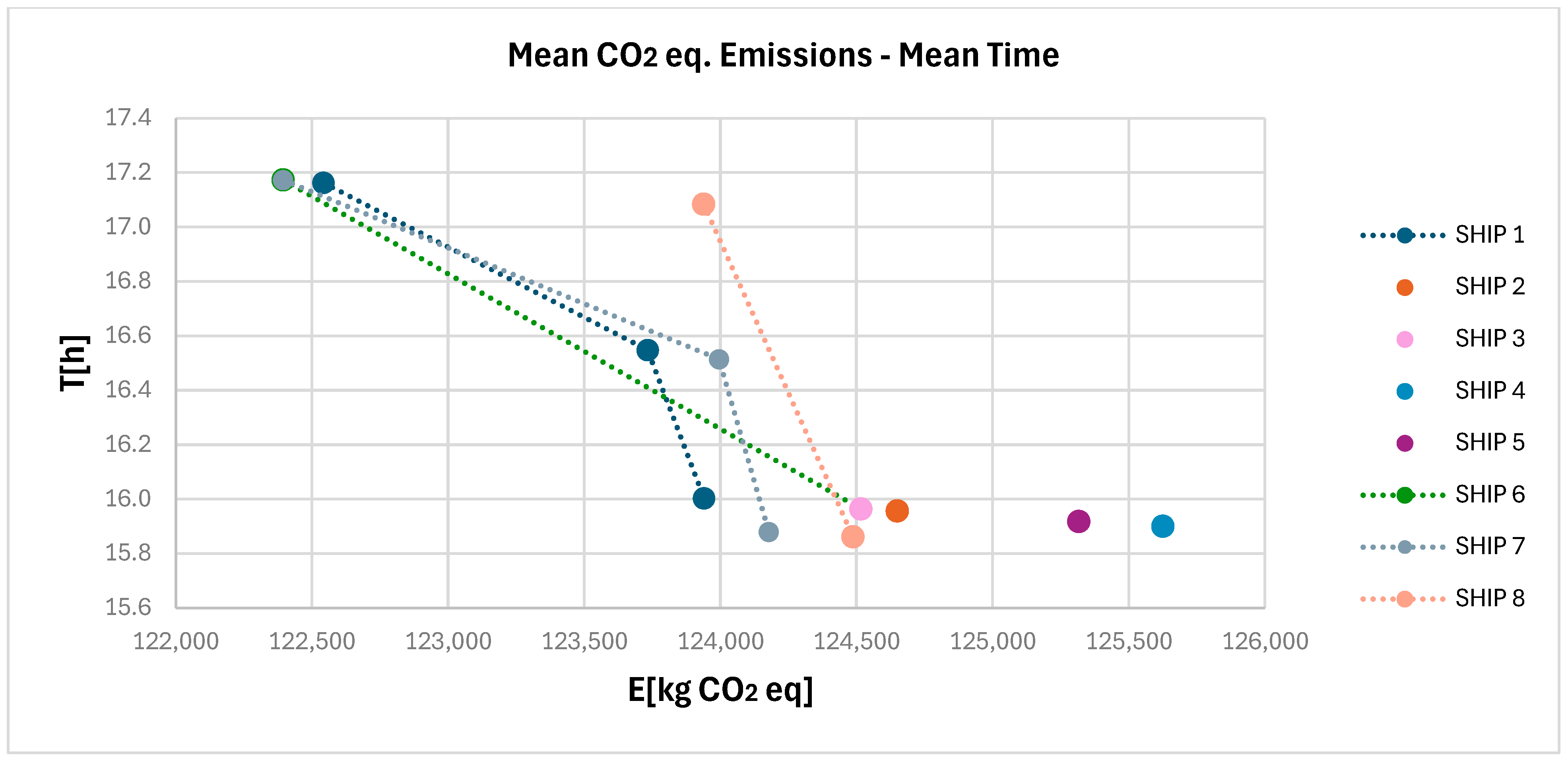 Scenario | Route | CO2 [kg] | CO2eq [kg] | T [h] | CO2 [kg] | CO2eq [kg] | T [h] | CO2 [kg] | CO2eq [kg] | T [h] |