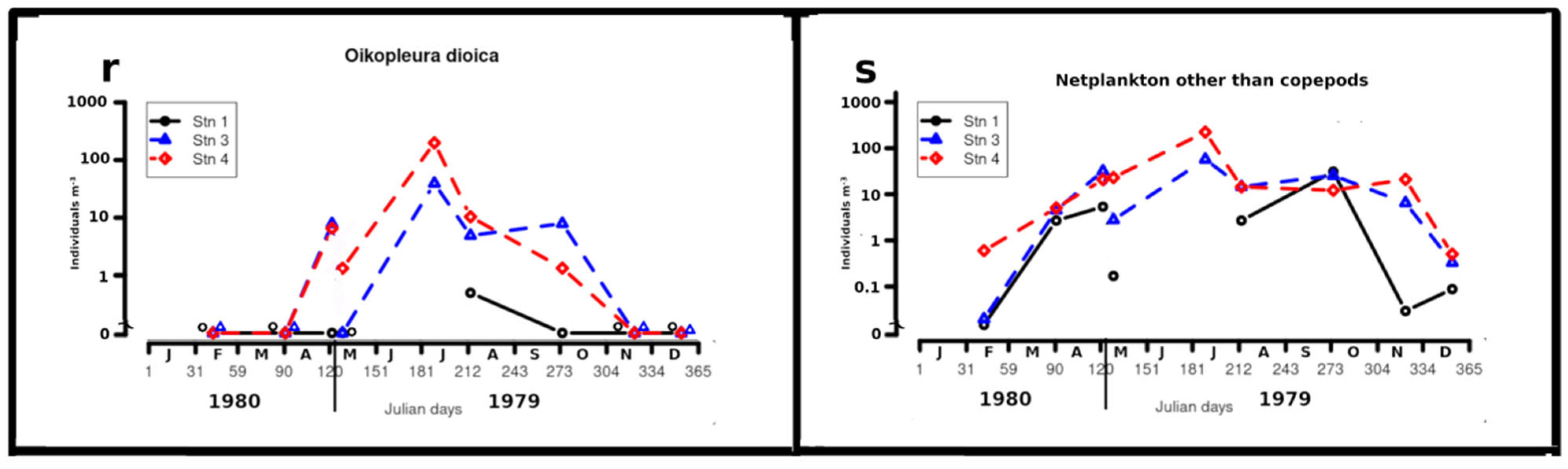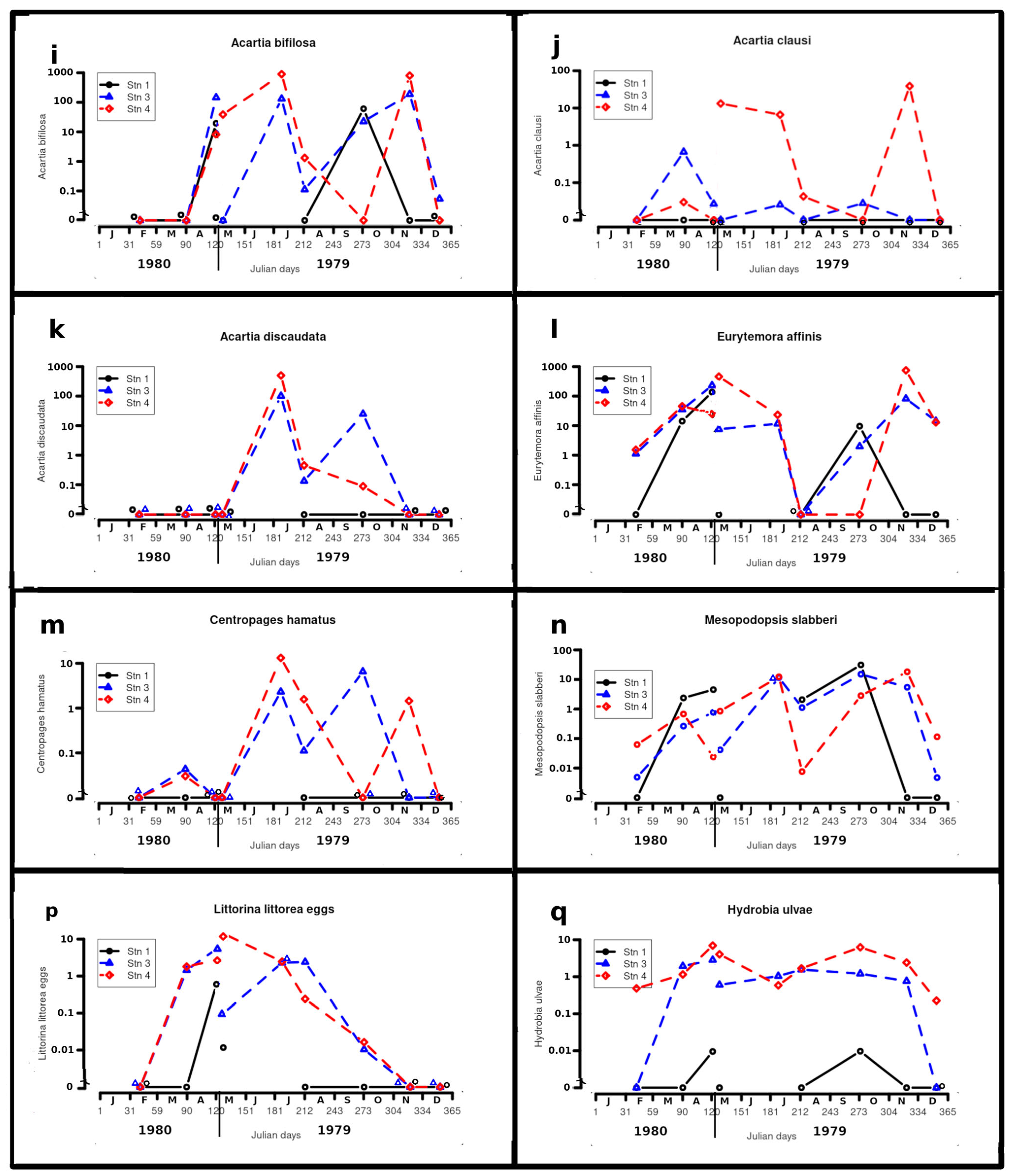 - Platichthys flesus: Flounder larvae and early juveniles (9–10 mm) occurred, most abundantly at Station 1 (~1 ind. m−3) in April and May.