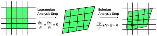 At each time increment, the solution procedure is divided into two distinct steps. The first is the Lagrangian analysis step, represented by Equation (9), in which the material is assumed to be tightly bonded to the mesh, so that the mesh deforms along with the material. This process is analogous to the traditional Lagrangian finite element method. The second is the Eulerian analysis step, represented by Equation (10), where time is held constant and only the spatial convection term is considered. The overall solution procedure of the CEL method is illustrated in Figure 1. In the Lagrangian analysis step, the traditional finite element formulation is employed to calculate the field distributions of various physical quantities after mesh deformation. In the Eulerian analysis step, the original regular rectangular mesh is used, and the material mass together with other field variables is remapped onto this mesh using a transport algorithm.