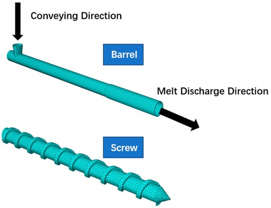 The extrusion equipment model was imported into the Abaqus 2020 software platform for numerical simulation. Abaqus is widely recognized as an authoritative tool in the field of complex mechanical behavior simulation and is highly compatible with the CEL method. Since the mechanical property changes of the equipment itself are not of primary concern during the extrusion process, both the screw and the barrel were modeled as rigid bodies. C3D8R solid elements were employed for meshing (as shown in Figure 2), enabling the solution of nonlinear problems such as contact, material plasticity, and large deformations.