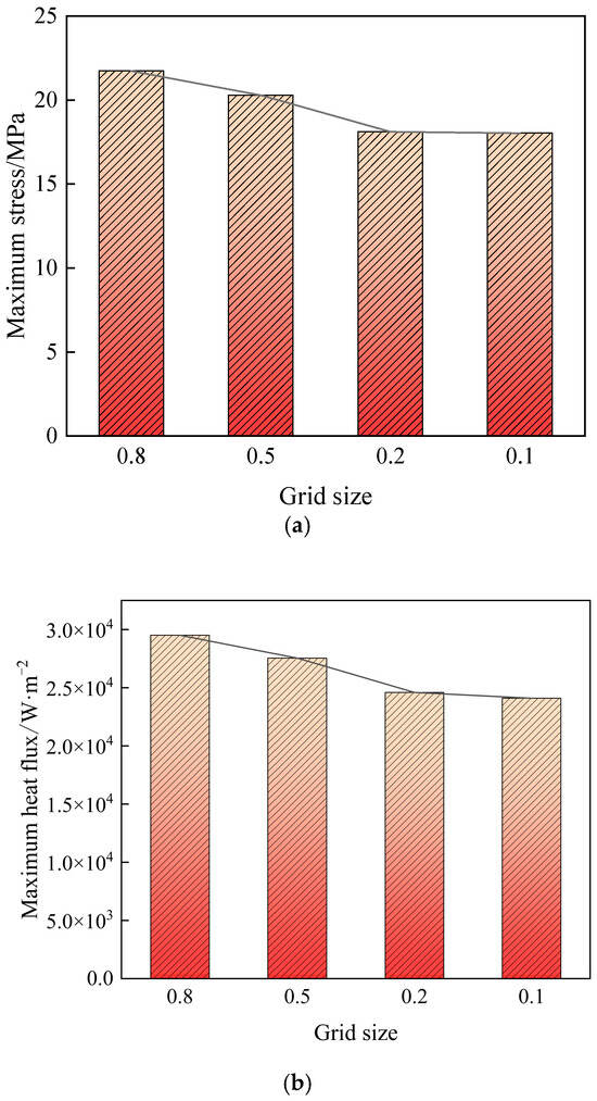 To eliminate the influence of mesh size on the calculation results, a sensitivity analysis was conducted on the mesh dimensions. Considering computational efficiency, the minimum mesh size was determined based on the overall dimensions of the model, while the maximum mesh size was defined according to the component sizes to ensure mesh regularity for each part. Four global mesh sizes (0.1 m, 0.2 m, 0.5 m, and 0.8 m) were selected for the sensitivity analysis. The maximum stress and maximum heat flux at the outlet of the model were compared for evaluation, as shown in Figure 4.