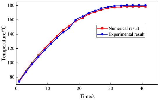 The extrusion outlet temperature under the operating condition of 180 °C was selected for comparative analysis, as shown in Figure 6. The results indicate that the temperature increases over time, and the numerical simulation model demonstrates a consistent variation trend with good overall agreement with the experimental observations, thereby verifying the reliability of the numerical simulation method.