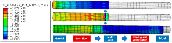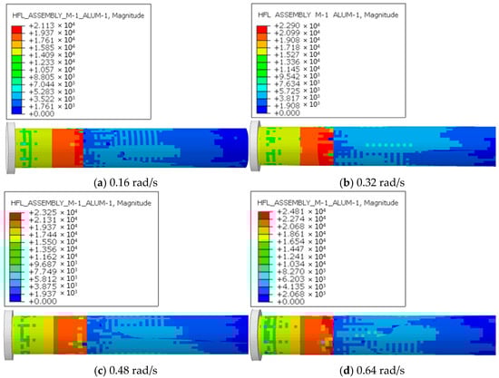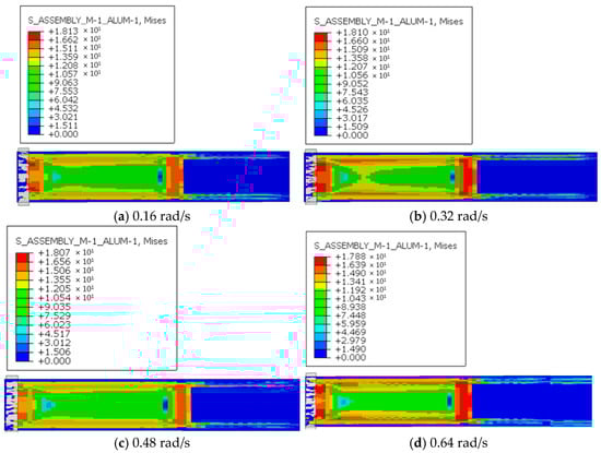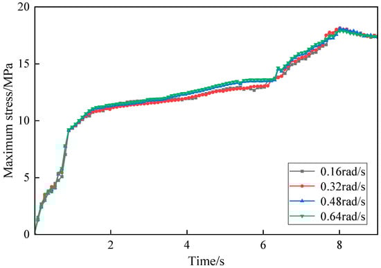 Figure 14 shows the time-history curves of maximum stress under four screw speed conditions. The variation in maximum stress over time is generally consistent across all four conditions. During the first 2 s, corresponding to the compression phase of the extruded material, stress increases sharply. This is followed by the extrusion forming phase, during which stress rises more gradually, reaching its maximum value and stabilizing around 8 s. A comparison of the four screw speed conditions indicates that as time increases, maximum stress grows with screw speed, although the stabilized extreme values differ only slightly.