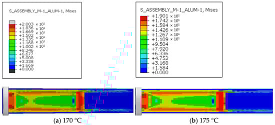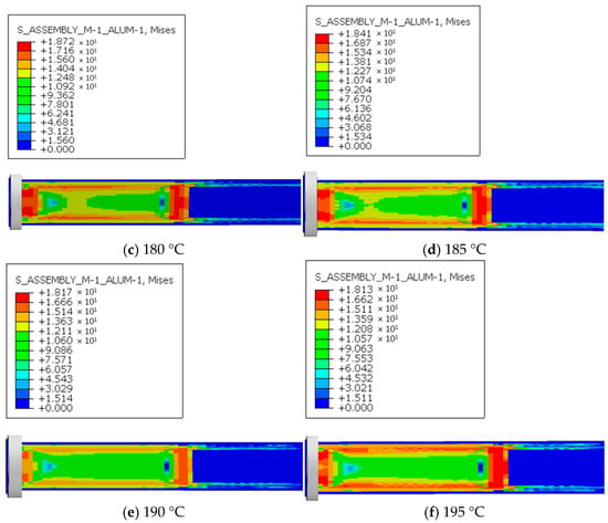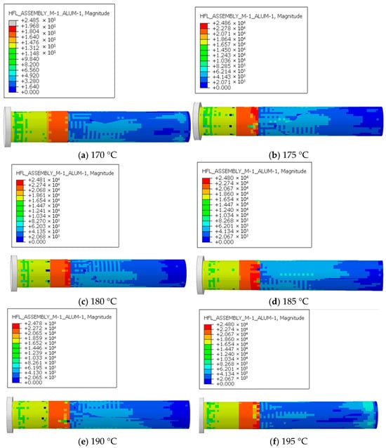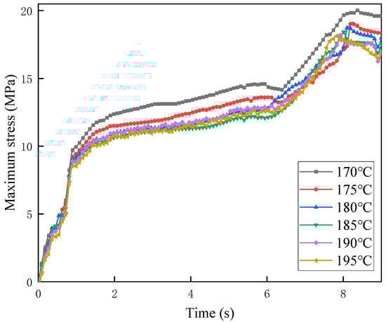 Figure 9 shows the maximum stress versus time curves under six outlet temperature conditions. The results indicate that the overall trends of maximum stress variation over time are similar, but the stress increase rate under 170 °C is significantly higher than that under the other temperature conditions. In the first 2 s, corresponding to the compression phase, stress increases sharply. This is followed by the extrusion forming phase (2–6 s), during which stress rises more gradually. After 6 s, stress again increases sharply and then stabilizes around 8 s at its maximum value. When the screw is not yet engaged with the melt, the stress remains at zero. As the screw compresses the material, interaction forces between the screw and melt increase, causing the steep stress rise observed in the first 2 s. Because the velocity gradient increases substantially but remains identical across different temperatures, the stresses are equal during this initial period. During material conveying (2–6 s), the resistance of the extruded melt increases, slowing screw acceleration and resulting in gradual stress growth. As cooling and forming occur, higher temperatures lower material viscosity and resistance while enhancing screw acceleration. This leads to a rapid stress increase between 6 and 8 s, which diminishes as the temperature rises, before stabilizing near 8 s. At higher temperatures, the maximum stress occurs earlier because increased molecular chain mobility accelerates the release of elastic energy stored during die swell.
