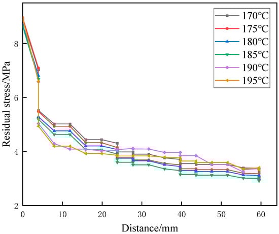 Figure 10 shows the residual stress distribution curves of the extruded parts under six temperature conditions. The results indicate that residual stress gradually decreases with increasing distance from the extrusion outlet. The earlier extruded parts exhibit lower residual stress, while the regions near the outlet retain relatively high residual stress, which decreases rapidly as extrusion progresses. This phenomenon occurs because the material undergoes rapid cooling and structural relaxation after extrusion. The molecular chains near the outlet have not fully completed orientation recovery and stress release, thus retaining higher residual stress. As the distance from the outlet increases, the molecular chains undergo further rearrangement and relaxation, causing the residual stress to gradually dissipate. A comparison of the six conditions shows that as the temperature increases, the residual stress level at the same position decreases, which is related to the earlier occurrence of maximum stress. Therefore, appropriately increasing the temperature can effectively reduce residual stress and improve the dimensional stability and mechanical properties of extruded products. However, when the temperature exceeds 190 °C, the reduction in residual stress with increasing distance from the extrusion outlet becomes significantly smaller. As a result, the residual stress levels at the far end of the outlet remain higher compared with those under lower temperature conditions. At this stage, further increasing the temperature can no longer effectively release the residual stress in extruded parts.