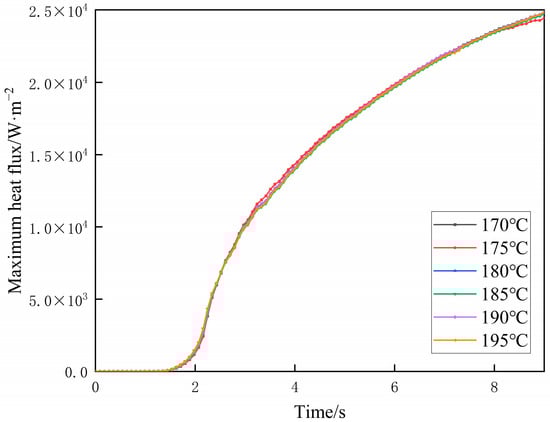 The time-history curves of maximum heat flux under six outlet temperature conditions are shown in Figure 12. The variations in heat flux over time are essentially consistent across all six conditions. During the first 2 s, corresponding to the compression phase of the extruded material, the heat flux increases rapidly. After extrusion begins, the heat flux continues to increase with time, but the rate of increase gradually decreases. A comparison of the six outlet temperature conditions shows that with increasing temperature, the variation range of heat flux extremes exhibits only minor differences.