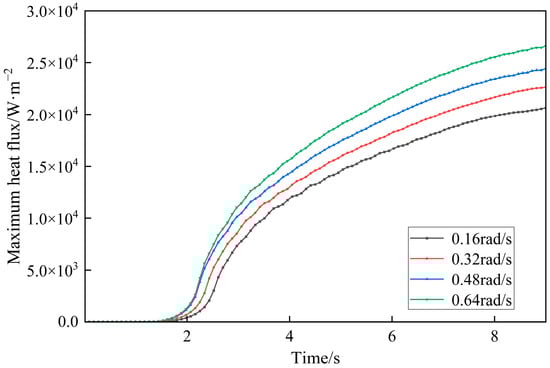 Heat flux–time history curve of the maximum heat flux element at different screw speed.