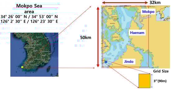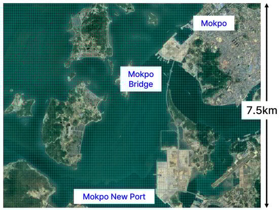 For spatial analysis, the study area was divided into grid cells of approximately 90 m × 90 m. Figure 2 presents an example in which the Mokpo region, one of the high-density traffic areas within the target area, was divided using this grid size. This illustration presents the level of resolution used for the grid. This grid size was deliberately chosen because it roughly corresponds to the length of medium-sized vessels, ensuring that the traffic information produced by the model is directly meaningful for route planning and navigational decision-making. Here, the term “resolution” refers not to the technical capacity of AIS equipment itself, but to the spatial resolution determined by the applied grid size in traffic modeling. The chosen resolution balances the positional accuracy of AIS data (approximately 10 m) while providing sufficient detail to represent the complexity of harbor waters. Compared with previous studies that typically employed grid sizes of 500 m to 1 km, the grid framework in this study offers greater applicability for fine-scale analysis in local areas such as narrow channels and port approaches.