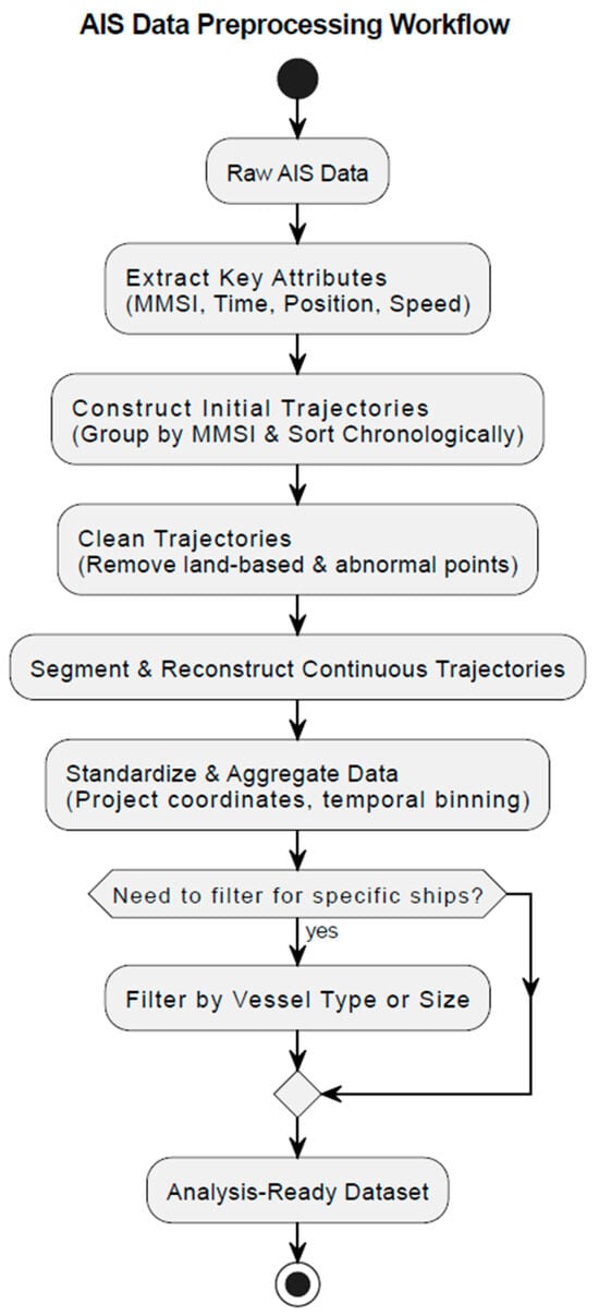 Additional preprocessing procedures were applied to refine the dataset further. Missing or erroneous values were removed, and coordinate data were projected onto a uniform spatial reference system to enable consistent grid indexing. Temporal aggregation was performed through hourly and daily binning, which aligned the dataset with the spatiotemporal resolution required for grid-based analysis. Finally, incoming data was filtered by vessel type or size where necessary in order to facilitate targeted analysis of specific ship groups. Figure 3 summarizes the overall workflow of these preprocessing steps.