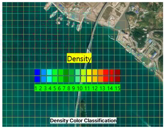 For visualization, the values were classified and color-coded into 15 levels (Level 1–15). Low-density areas were represented by blue–green tones (Level 1–5), medium-density areas by yellow tones (Level 6–10), and high-density areas by red tones (Level 11–15). This design allows users to intuitively recognize areas with concentrated vessel activity. For instance, Level 1 indicates lowest-density cells with the fewest passages, while Level 15 represents cells with the highest traffic density within the study area.
