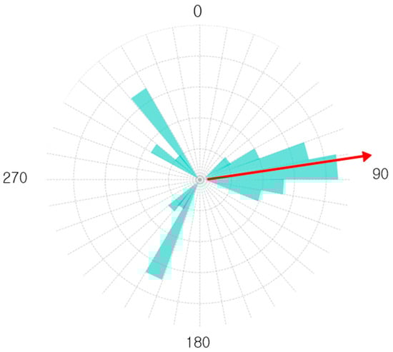 Each AIS sample was then classified into its corresponding sector, and the sector with the largest number of samples was defined as the dominant direction, as shown in Figure 5 and illustrated in Equation (4).