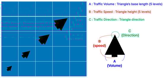- Proposal of a traffic flow visualization model: A traffic flow diagram was designed so that it integrates density, average speed, and dominant direction within each grid cell into a single arrow symbol.