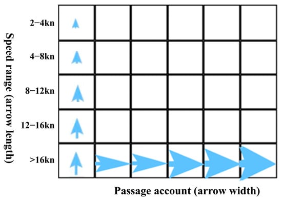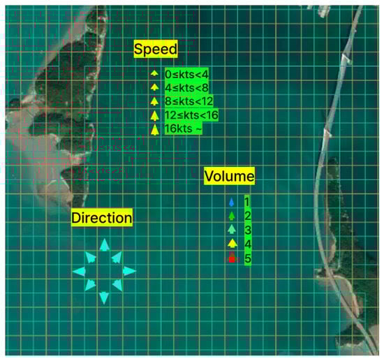 To reflect navigational characteristics, the representative speeds were categorized into five intervals: 0 ≤ kts < 4, 4 ≤ kts < 8, 8 ≤ kts < 12, 12 ≤ kts < 16, 16 kts (Table 2). In the visualization stage, these intervals were mapped to the relative length of arrows, enabling intuitive distinction between low-speed and high-speed navigation zones. In this context, SPD categorization into five intervals was designed to capture practical navigation characteristics, where arrow length serves as a visual proxy for relative vessel speed in each cell.