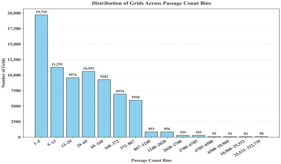 However, the actual distribution of AIS data tends to be excessively concentrated within certain ranges, particularly in low-speed intervals or grid cells with small passage counts. When equal-interval classification is applied in such cases, samples are heavily skewed toward the lower ranges, leading to visual distortion. For example, more than half of the total data may fall into the lowest category, while the upper categories remain underrepresented or diluted, as illustrated in Figure 9.