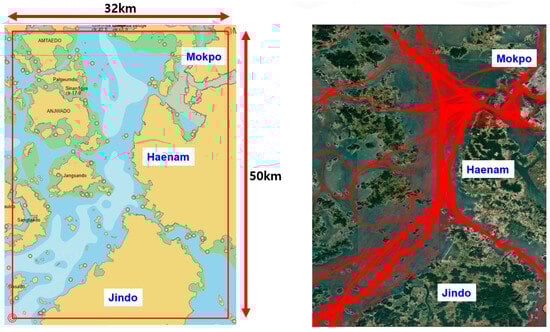 The study area covers approximately 50 km of coastal waters near Mokpo in Jeollanam-do, a critical node of West Sea coastal routes and a region with converging island routes. This area represents a highly complex traffic environment, with port-entry vessels, coastal ferries, and fishing vessels all operating simultaneously []. In particular, port approaches to the North Port, New Mokpo Port, as well as adjacent narrow channels, experience high levels of traffic density and frequent interference between vessel routes. Such conditions provide an appropriate setting for applying and validating the proposed traffic model. Figure 1 shows the target area near Mokpo.