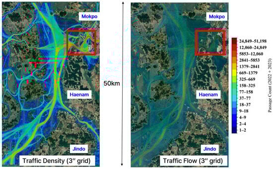 This section presents the visualization results of applying the proposed traffic model (density and flow) to AIS data in the study area. The results confirm how traffic density and flow structures appear at the grid level and allow comparative analysis of characteristics across different subregions. The visualizations first show the overall distribution across the entire study area, followed by detailed analyses of specific traffic-concentrated zones such as port approaches, narrow channels, and offshore connecting routes.