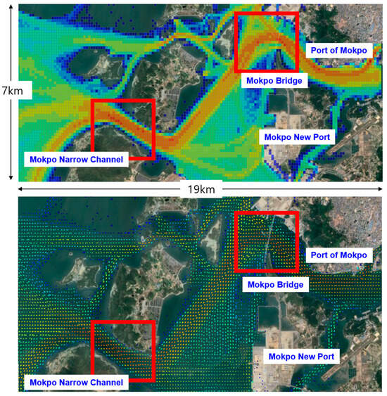 Based on the preprocessed AIS data, the baseline traffic distribution of the study area was first examined. Figure 10 overlays two years of AIS data collected in the Mokpo coastal region onto a map, showing that the processed position reports form linear patterns along actual shipping routes. As illustrated, traffic is concentrated around port approaches and narrow channels, particularly along the approach routes connecting North Port and New Mokpo Port, the narrow channel near Mokpo Bridge, and the offshore routes. In contrast, the outer coastal areas and island waters show sparse distribution, clearly differentiating between major and secondary routes. These results not only confirm that the study area is a traffic-intensive region where West Sea coastal and island routes intersect, but also validate that it provides suitable conditions for applying and verifying the proposed density and flow visualization model. Based on this data distribution, the next subsection presents density and flow results derived from the calculation procedures described earlier.
