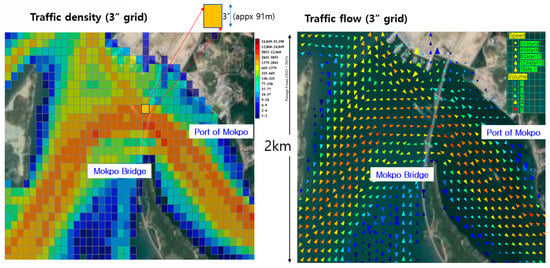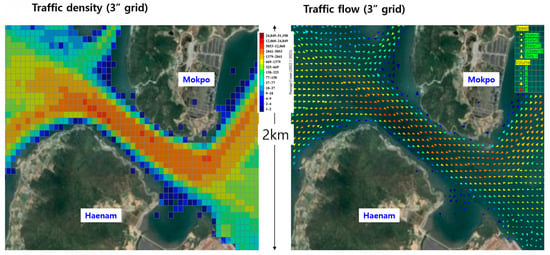 Visualization of traffic density and traffic flow (close view, ~2 km: Port of Mokpo approach).