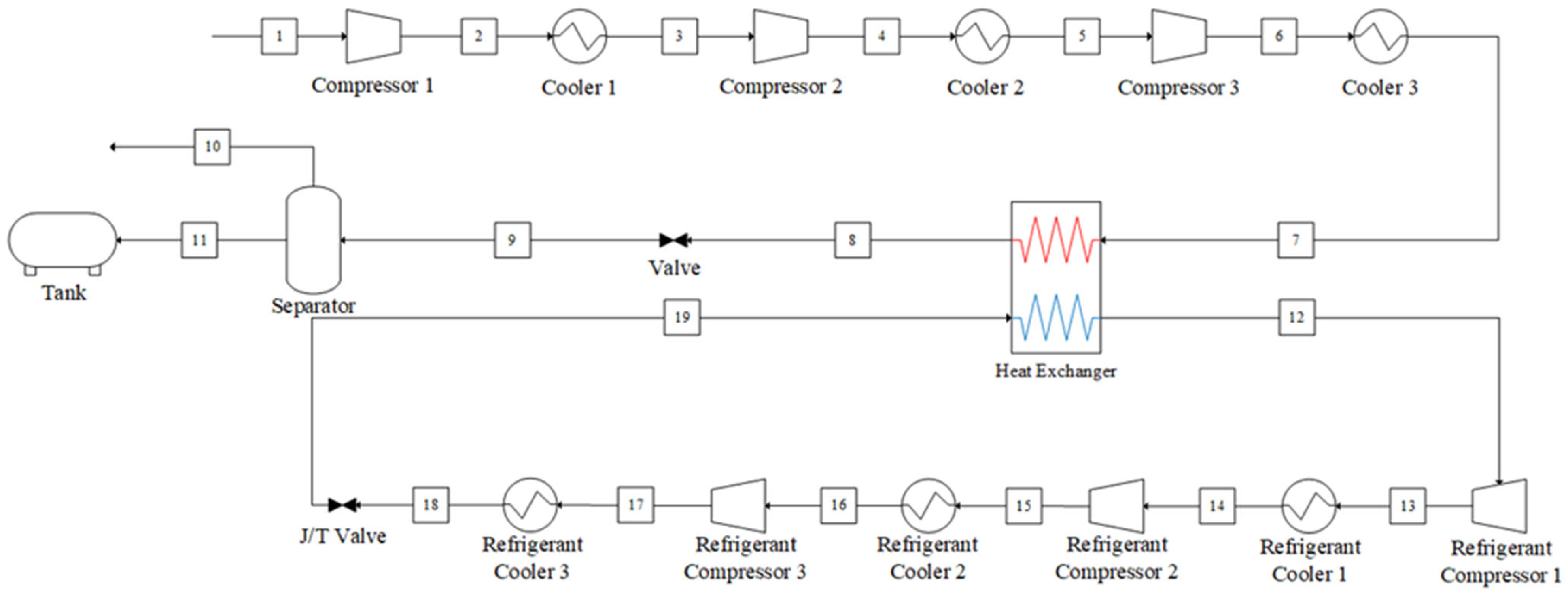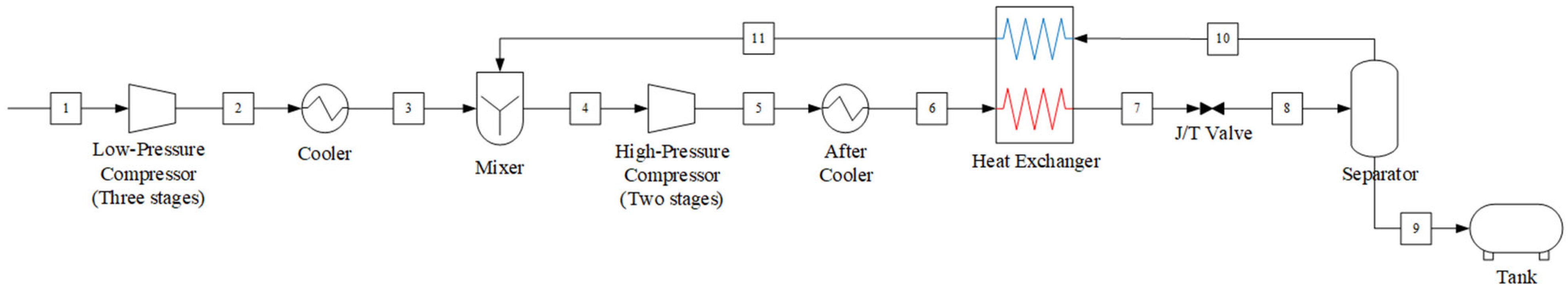 - Expansion: The high-pressure supercooled liquid expands through the Joule–Thomson valve, producing a low-temperature vapor–liquid mixture. In the downstream separator, CO2 is separated into gas and liquid phases. The separated CO2 vapor is recycled to the inlet of the first high-pressure compressor via the heat exchanger, while the liquified CO2 is transferred to the storage tank.