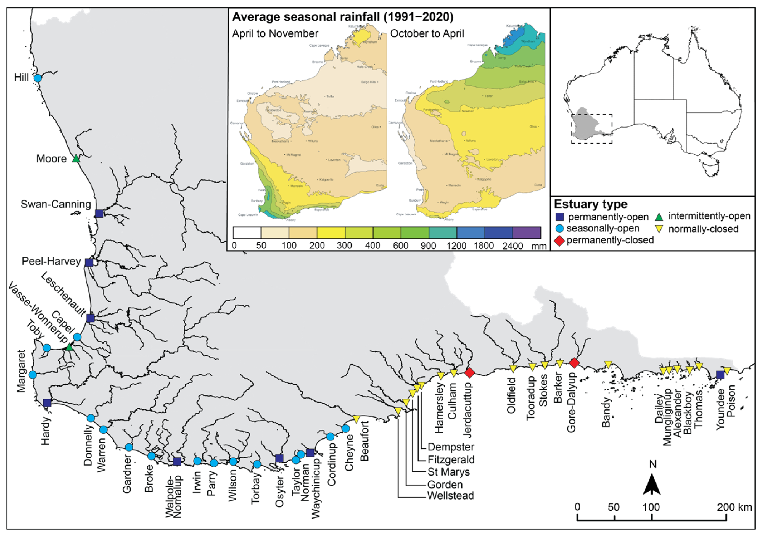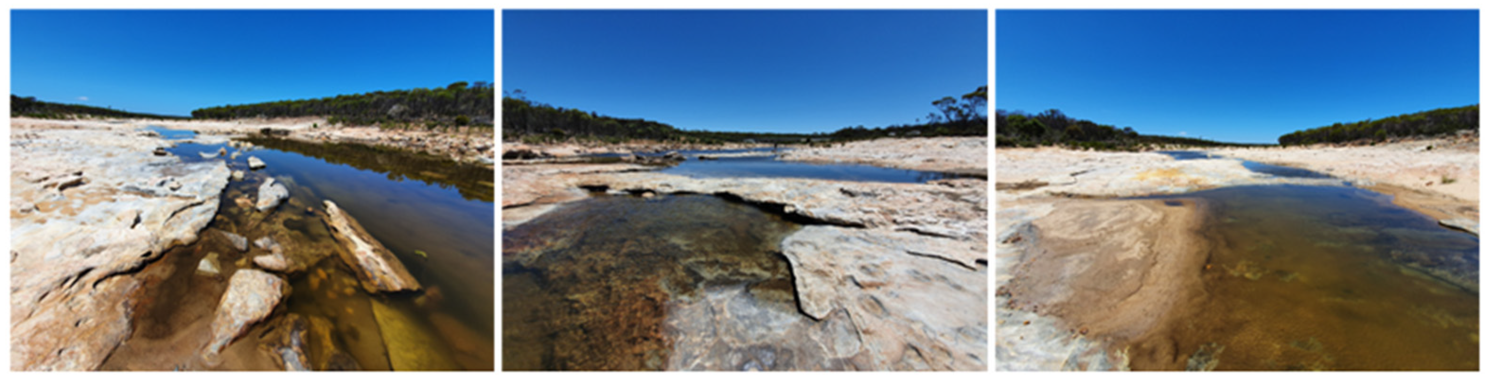 - Tweedley, J.R.; Krispyn, K.N. Protracted bar closure temporarily transforms an estuary into a salt lake. Pac. Conserv. Biol. 2024, 30, PC24007. [Google Scholar] [CrossRef]