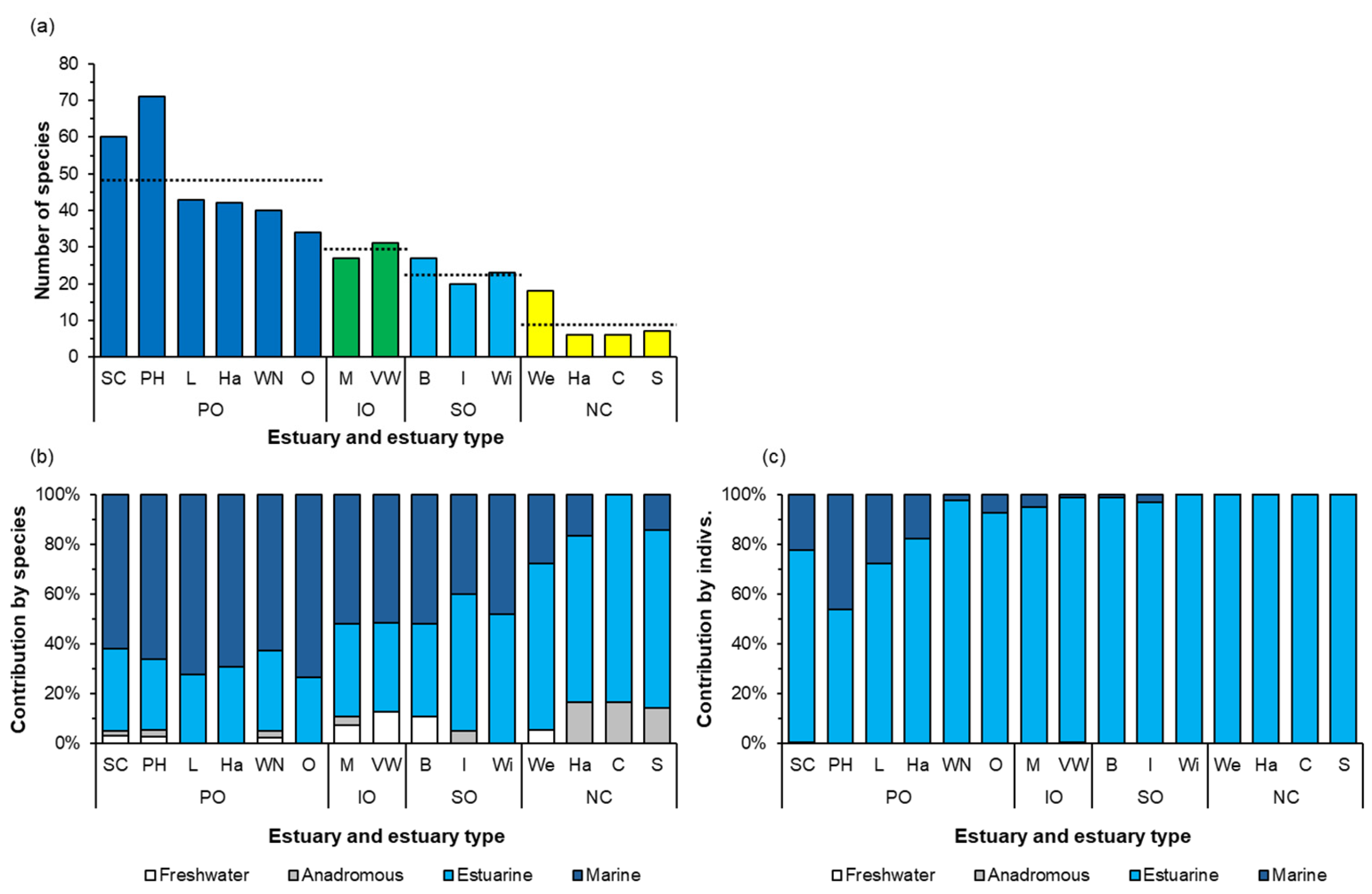 - Whitfield, A.K.; Harrison, T.D.; Tweedley, J.R. Comparisons between estuary-associated ichthyofaunas in ecoregions around the Indian Ocean. Estuar. Coast. Shelf Sci. 2025, 321, 109335. [Google Scholar] [CrossRef]